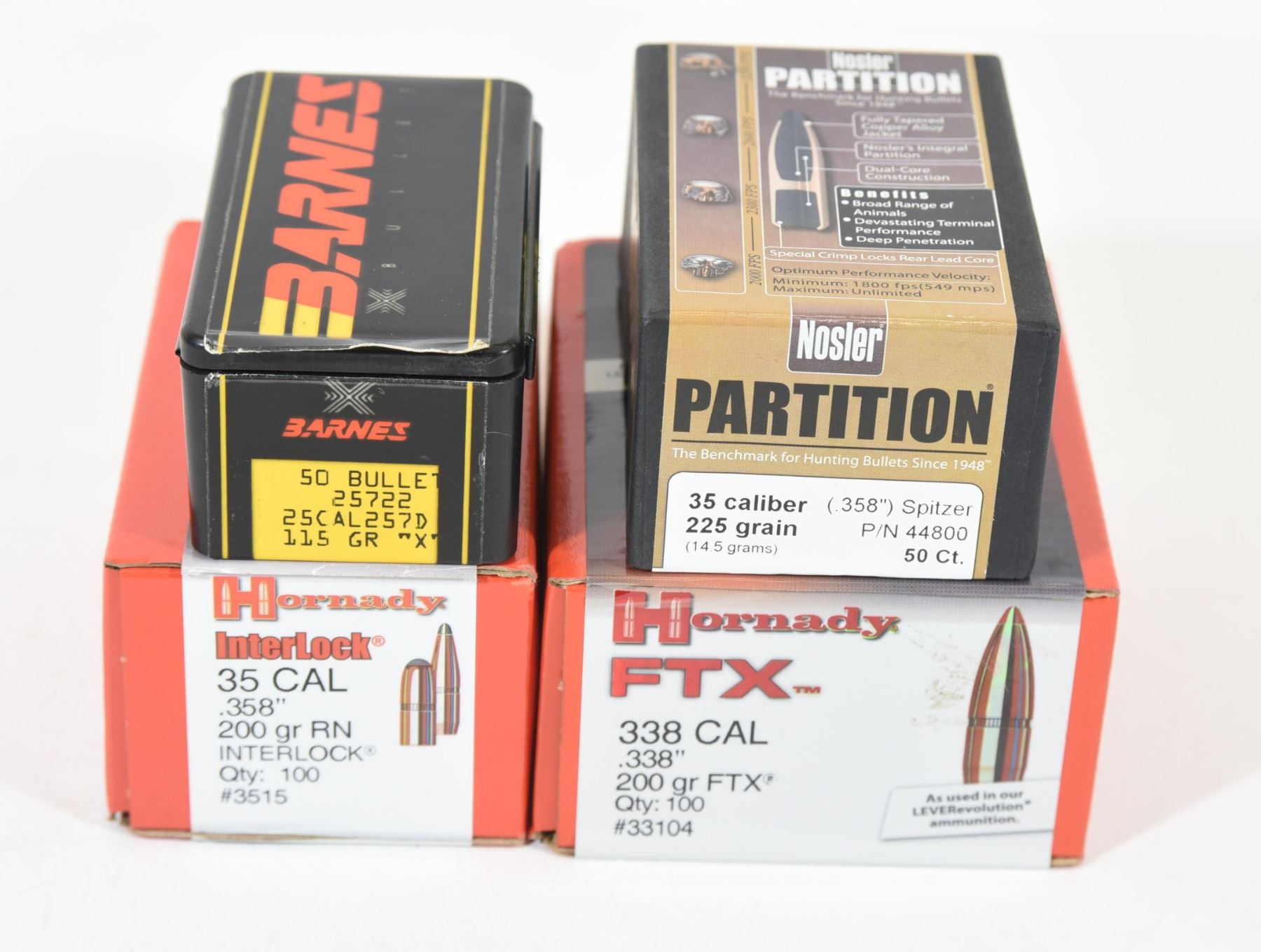 1) 100 pieces Hornady FTX 338 caliber .338" 200 grain. 2) 100 pieces Hornady 35 caliber .358" 200 grain RN Interlock. 3) 25 pieces Nosler Partition 35 caliber 225 grain. 4) 46 pieces Barnes 25 caliber 115 grain "X".