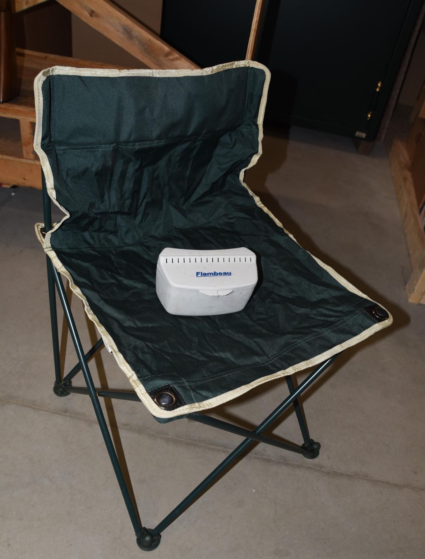 Model number 2000002388. Appears to be in good condition, no pump included. Child's folding chair in good condition and a Flambeau plastic bait/tackle holder.