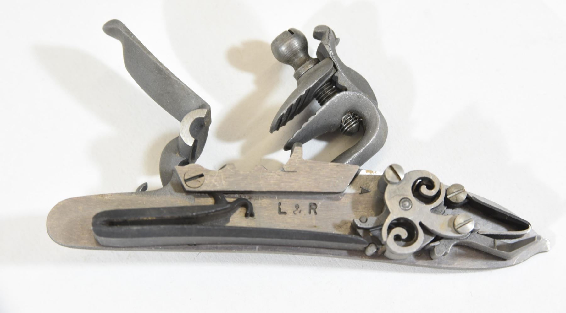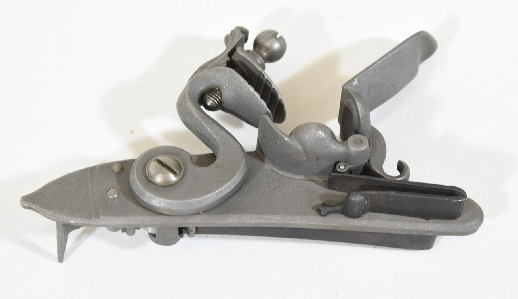 New reproduction by the L & R Lock Company Durs Egg was a master English gun maker. This copy of an original lock features a waterproof pan, pierced bridle, fly in the tumbler, stirrup-type mainspring, and a roller mounted frizzen on an internally polished plate. Available in both left and right hand models. This is one of L&Rs’ best locks. May require some final tuning and polishing to make this lock perform at its best design. Plate measures 5”x 15/16”, Uses 3/4” flints, #FLINT6FR or #FLINT6E.