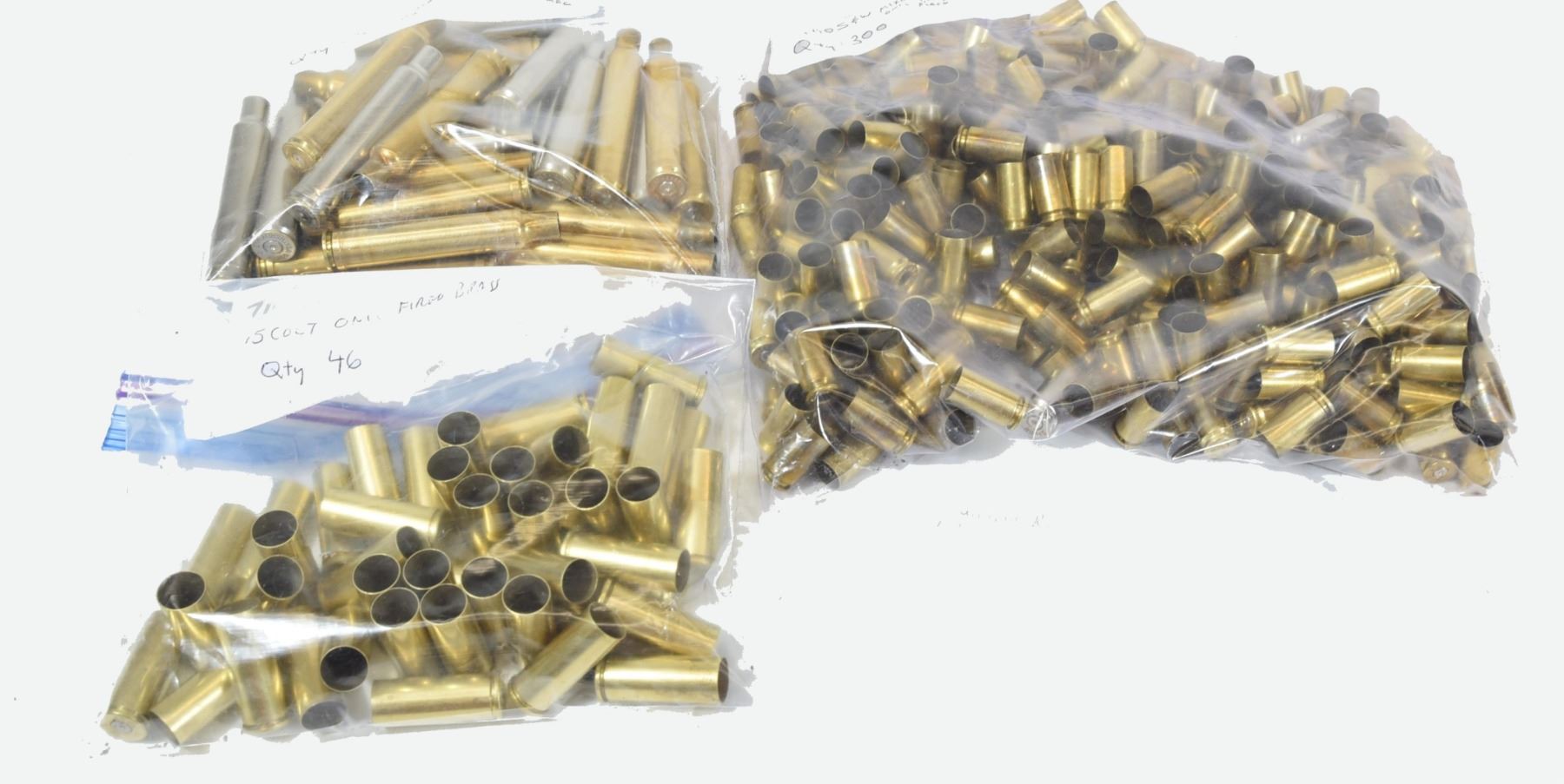1) 46 pieces of .45 Colt once-fired brass. 2) 31 pieces of .300 Weatherby magnum once-fired brass. 3) 300 pieces .40 S & W mixed once-fired brass.