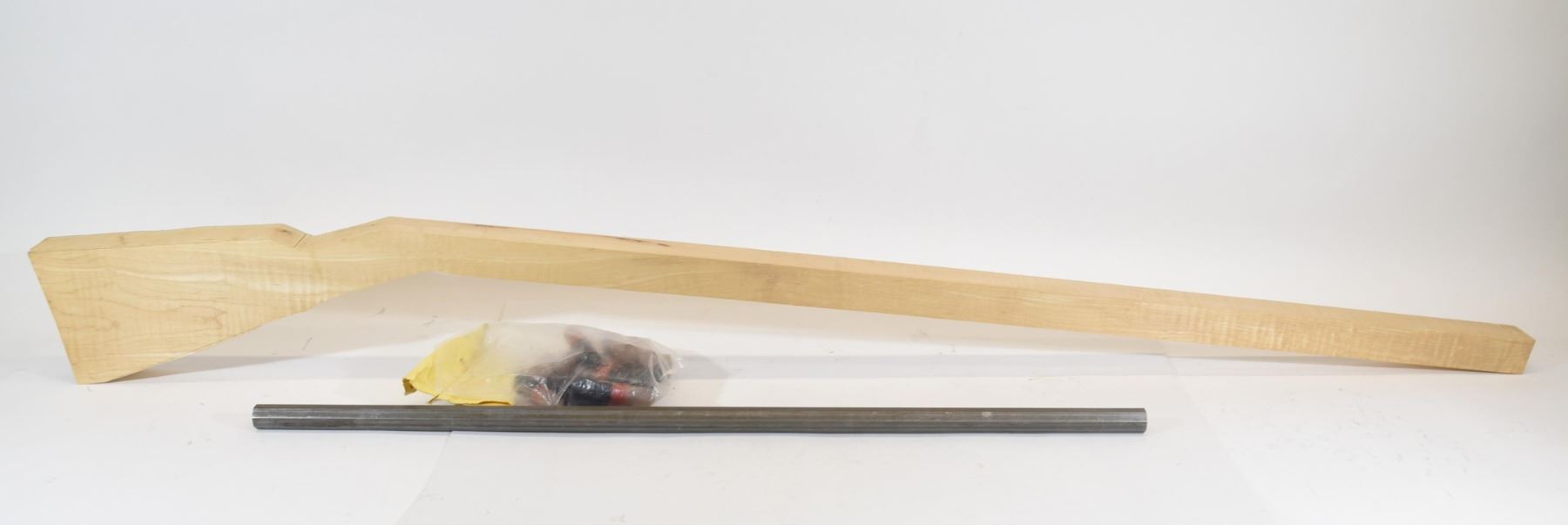 45 caliber roughly 32 3/4" octagonal rifled and crowned barrel only. Bore is very good. Comes with blank maple stock and a dozen charging tubes.