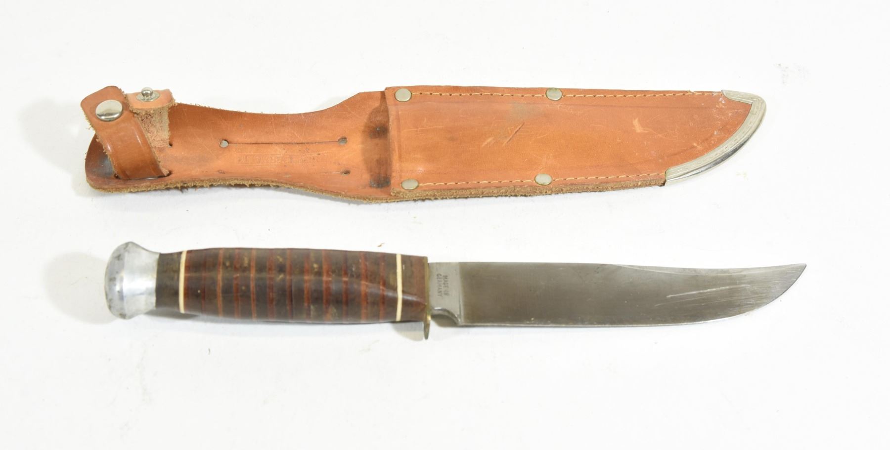 5 1/4" blade has never been sharpened. Lightly used if at all. Blade has some marks, handle has some marks, the butt knob is a little loose, leather sheath is in good condition.
