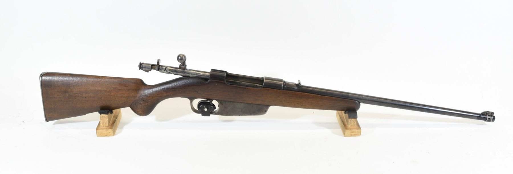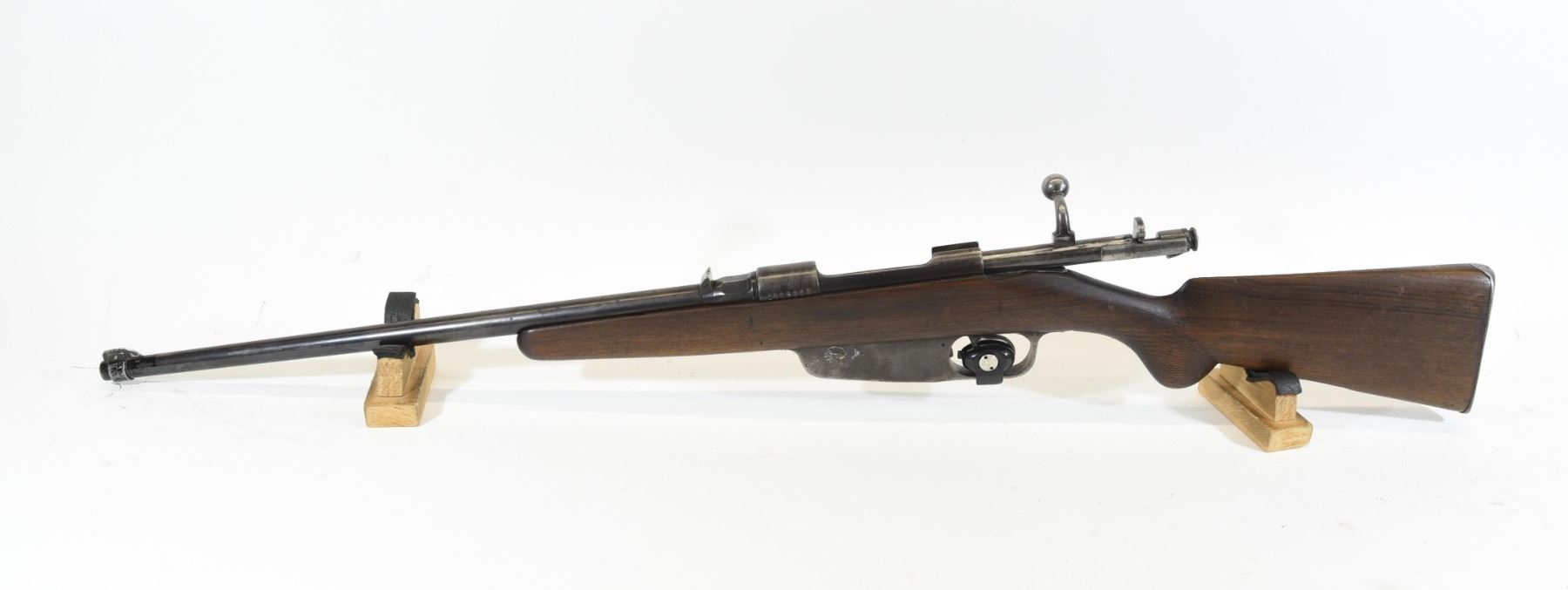 Non-restricted, bolt action, 6.5mm x 52 Italian, 20" barrel, SN 1905357. Wood has a chip forming behind upper tang, bluing turning brown, bore stained from corrosive ammo, rifling prominent.