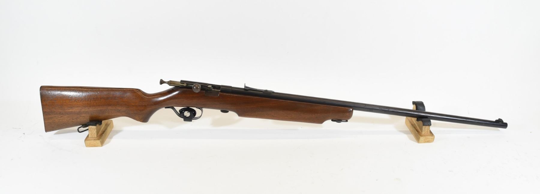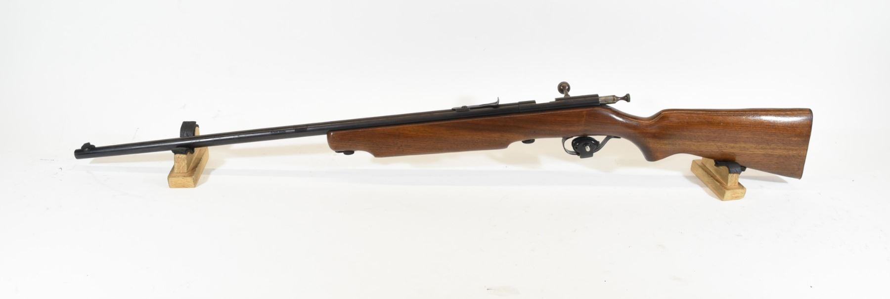Non-restricted, single shot, 22 LR, 26 3/4" barrel, SN 1009. Wood has a few small dents, bluing is brown, bore good.