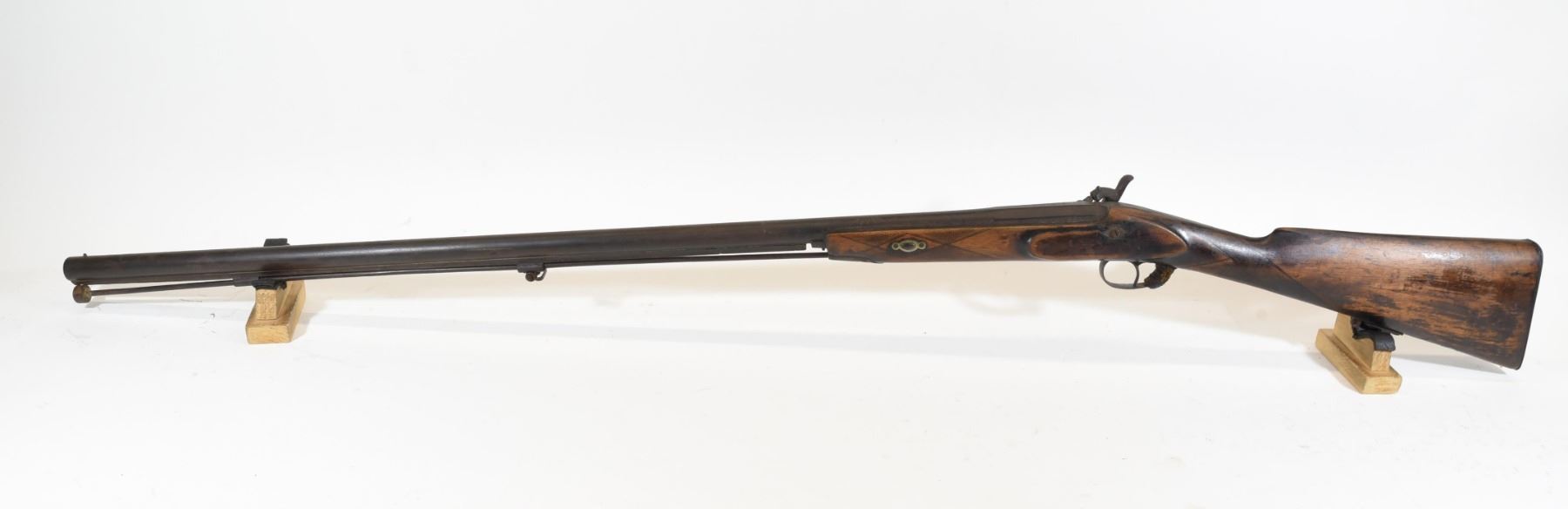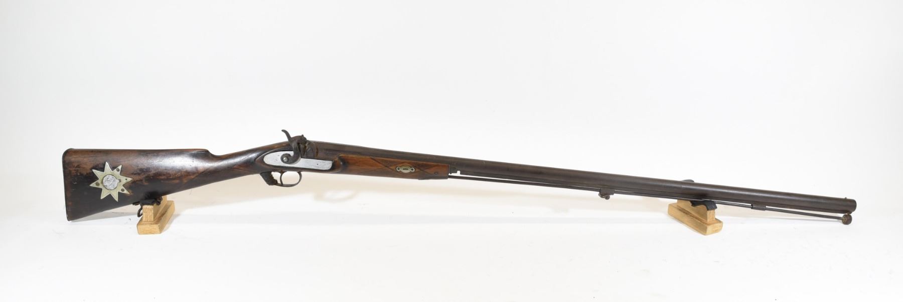 Non-restricted, single shot, 12 Ga percussion, 36" barrel, SN none. Wood has a small crack on left side at lock anchor, bluing is rusty and pitted, bore pitted.