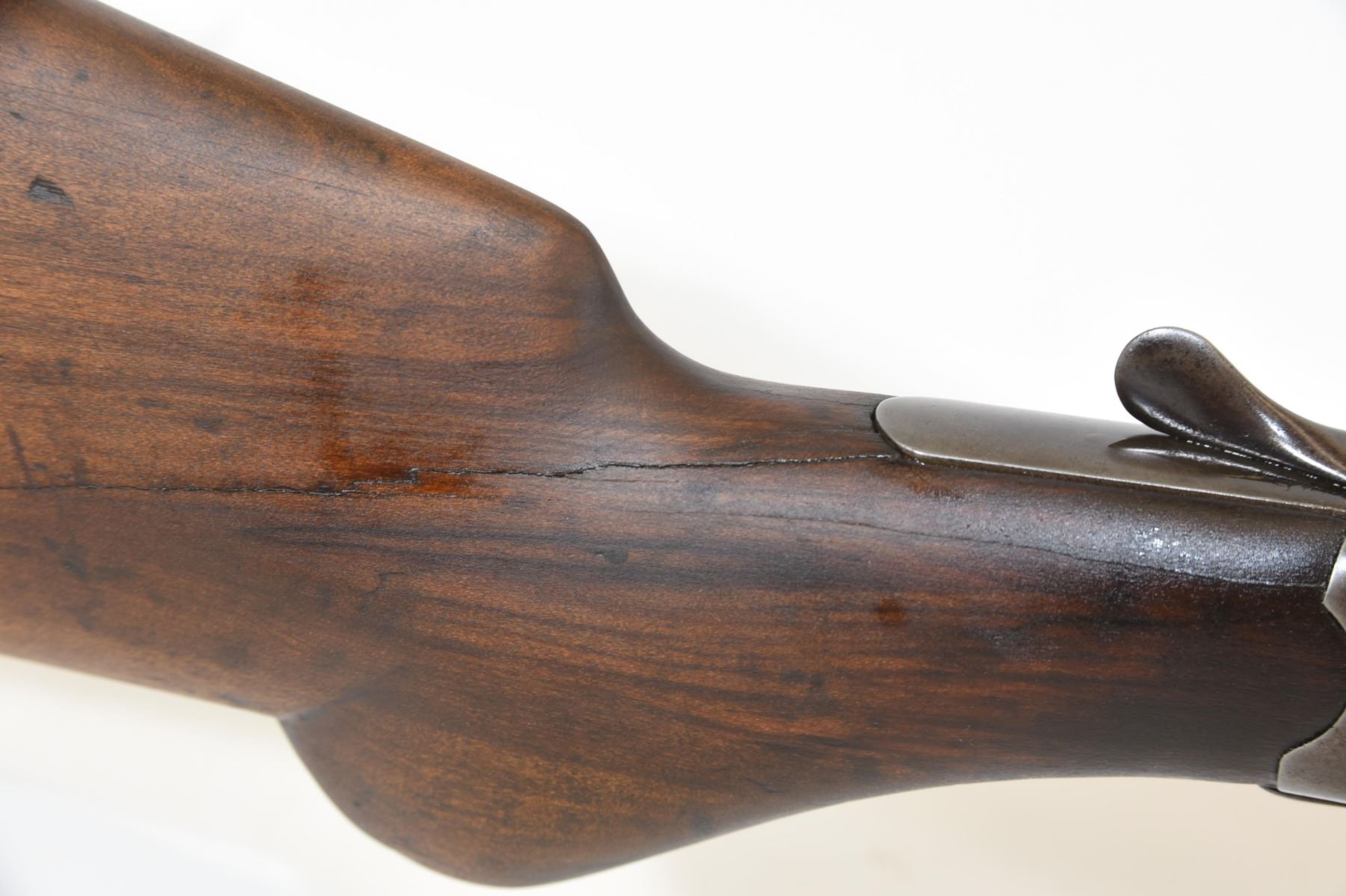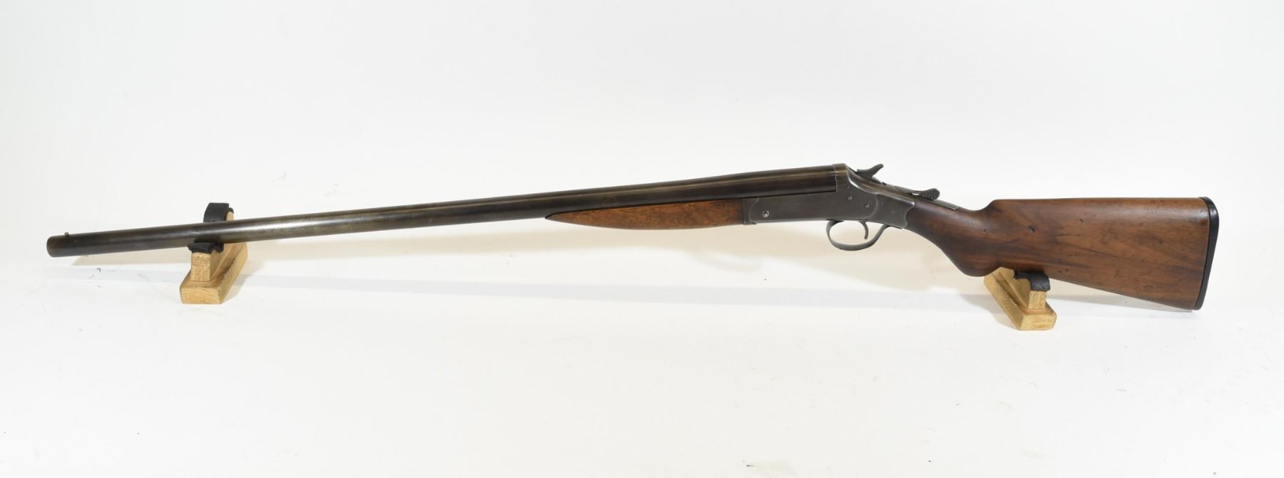 Non-restricted, single shot, 12 Ga x 2 3/4", 29 3/4" barrel with fixed full choke, SN none. Wood cracked behind lower tang, bluing is brown, bore pitted.