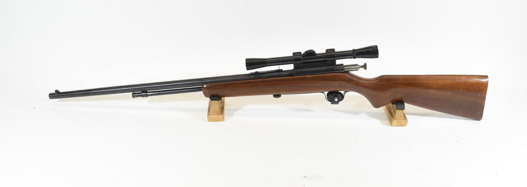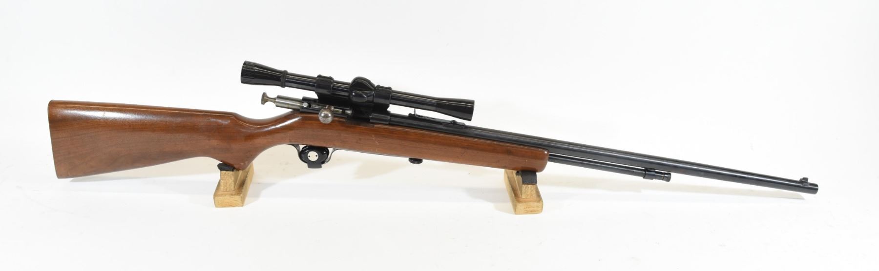 Non-restricted, bolt action, 22 LR, 24" barrel, SN none. Wood has a few marks and scratches, bluing has a few areas of pitting on barrel, bore excellent. Comes with Weaver C4 scope.