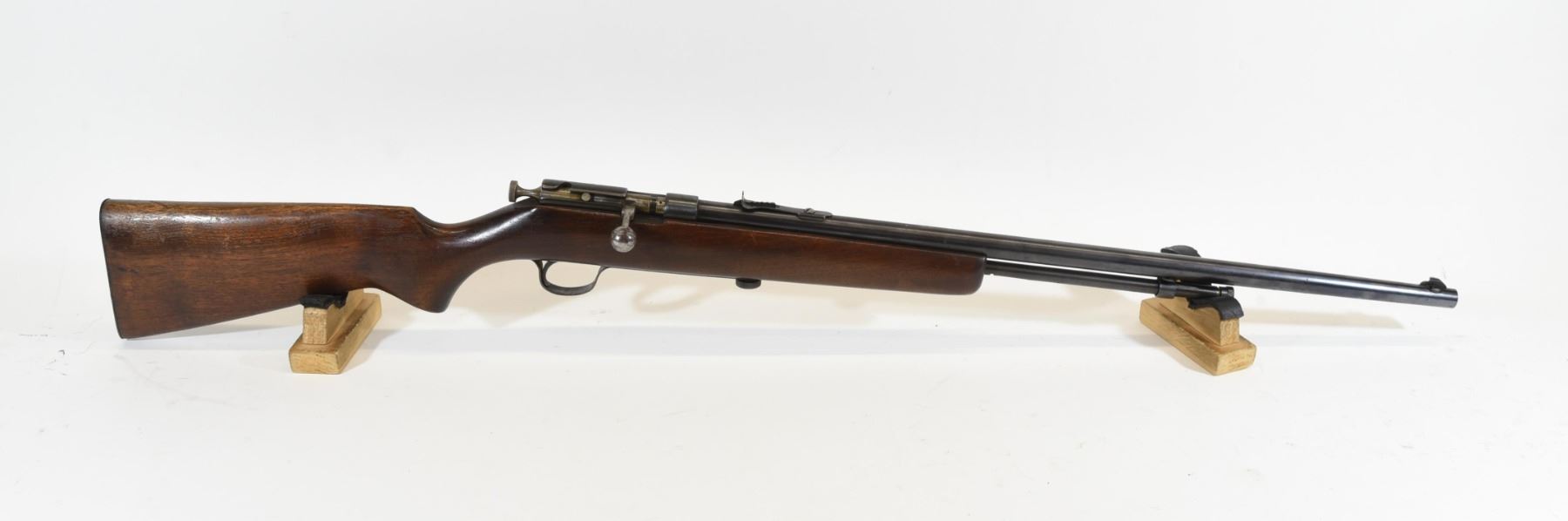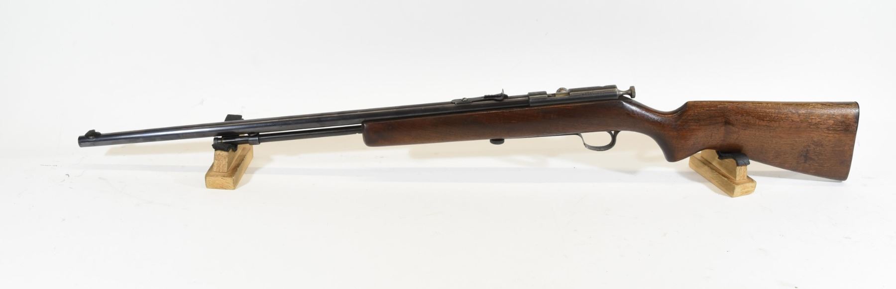 Non-restricted, bolt action, 22 LR, 24" barrel, SN none. Wood finish is lifting, bluing is worn on receiver and small pits on barrel, bore very good.