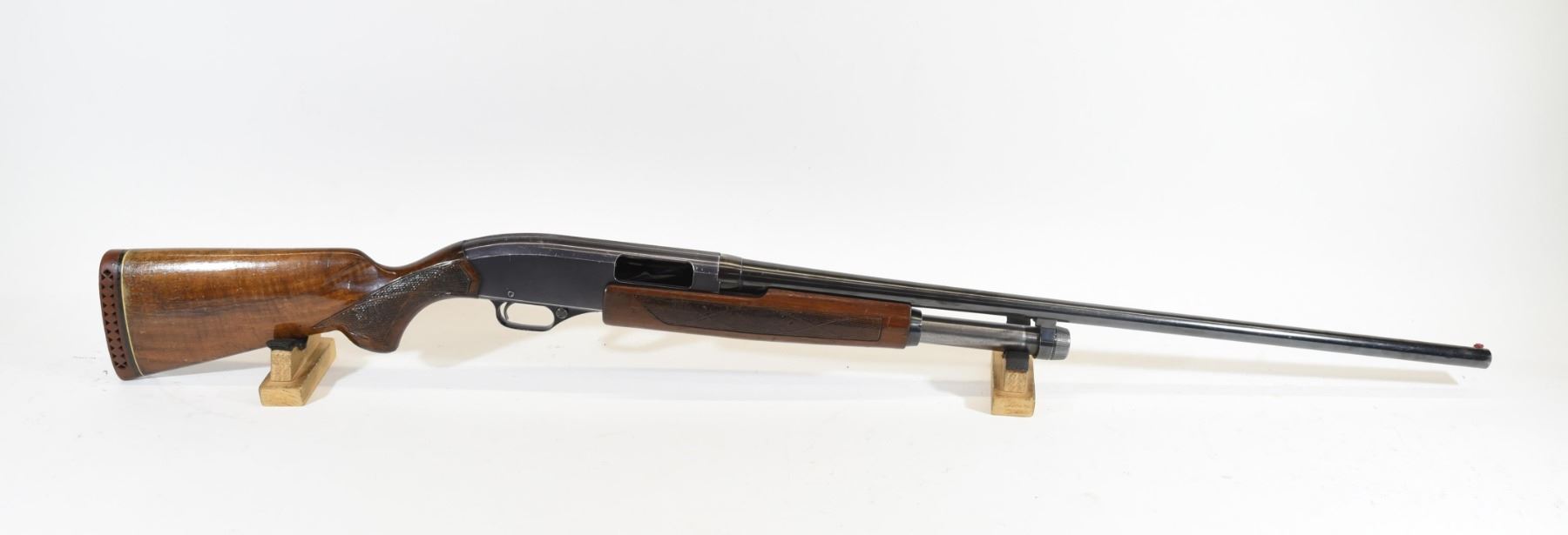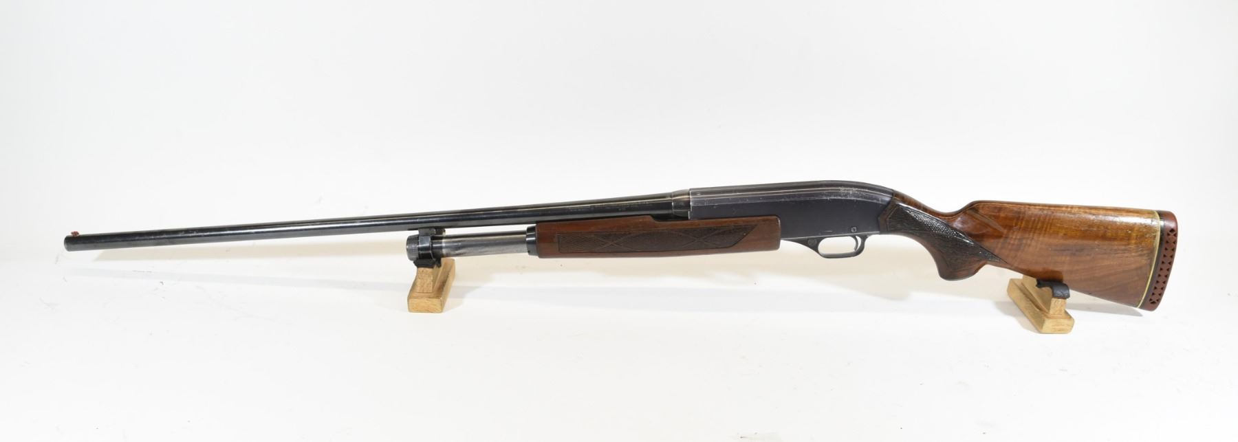 Non-restricted, pump action, 12 Ga x 2 3/4", 28" barrel with fixed modified choke, SN 434151. Wood has numerous scratches and marks, bluing is worn with numerous scratches and marks, bore excellent.