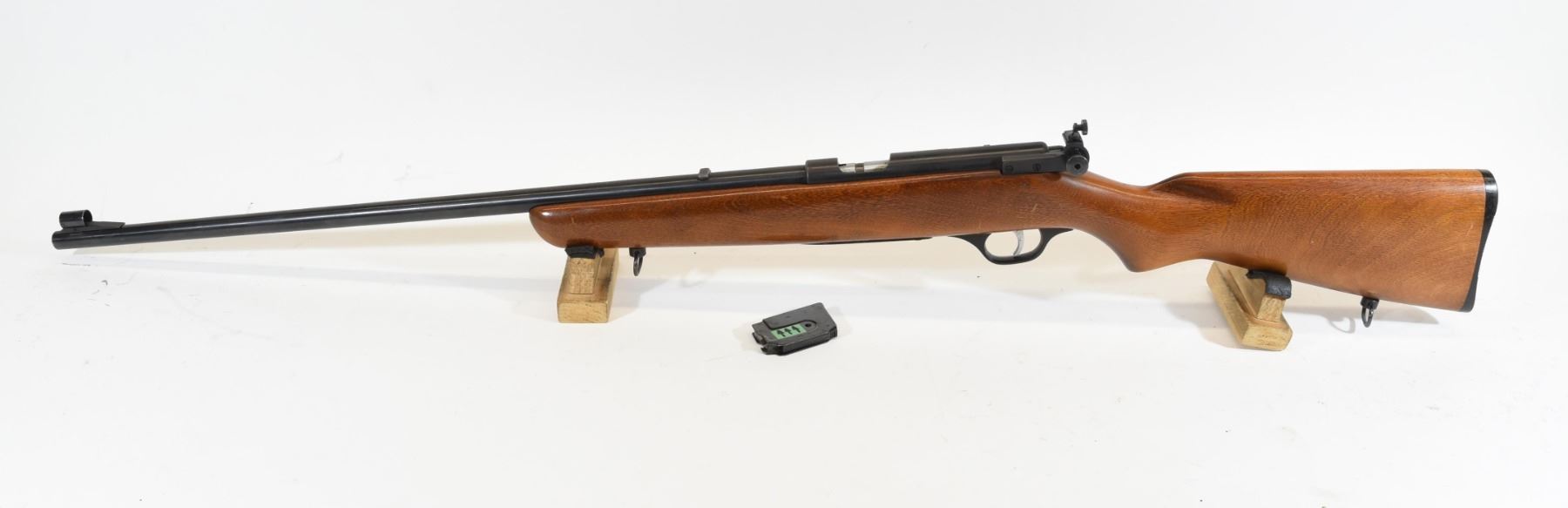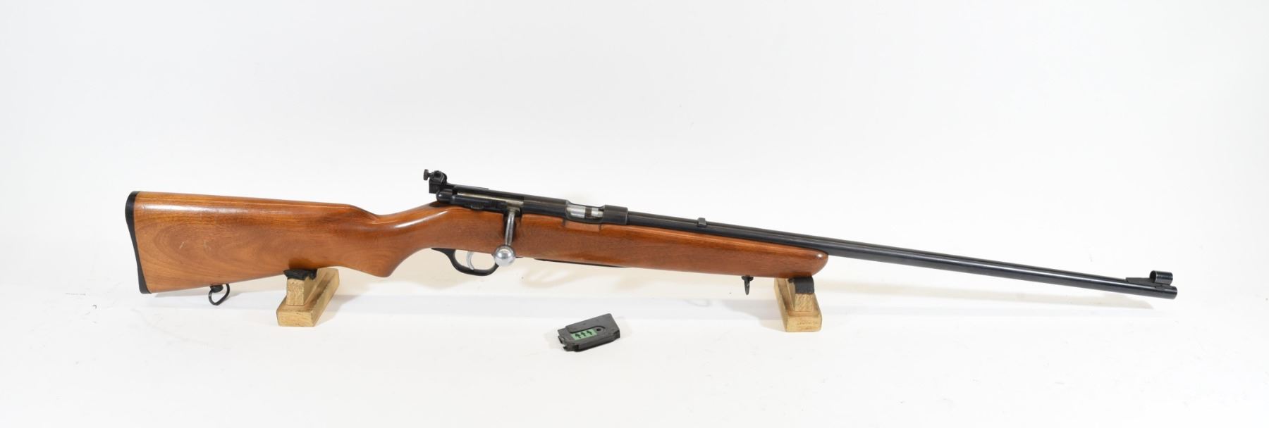 Non-restricted, bolt action, 22 LR, 24" barrel, SN none. Wood has a few marks in the finish, bluing has very light pitting all over, bore excellent. Comes with rear peep.