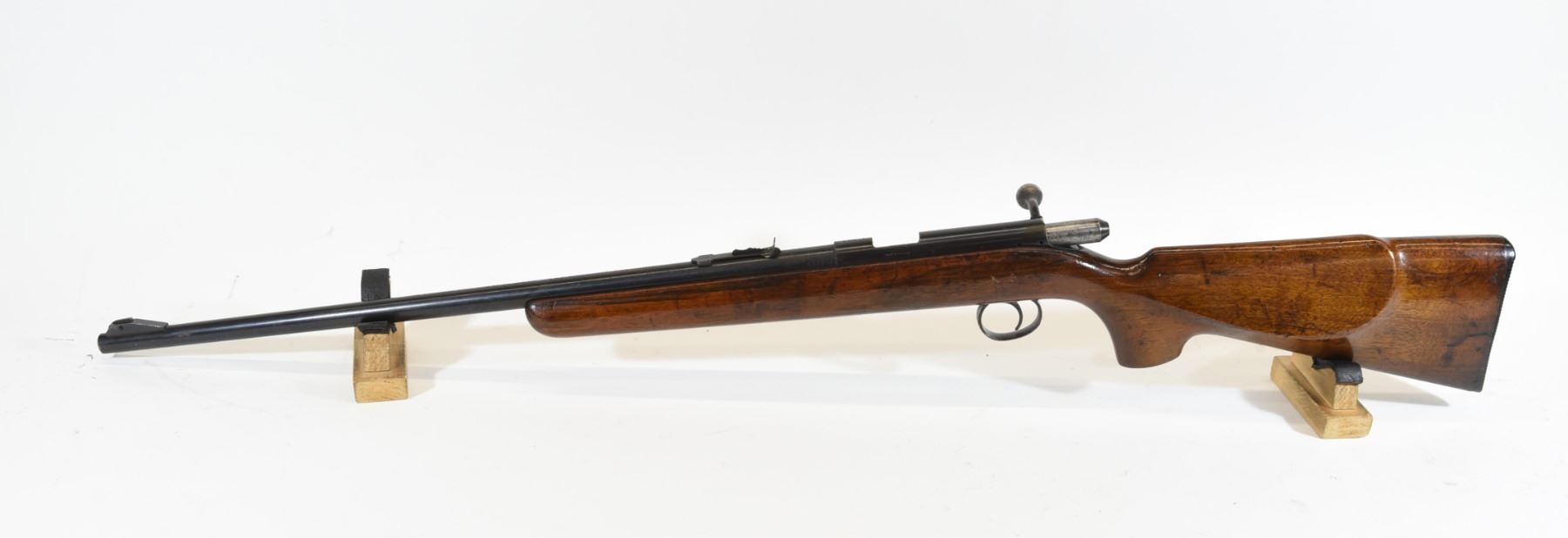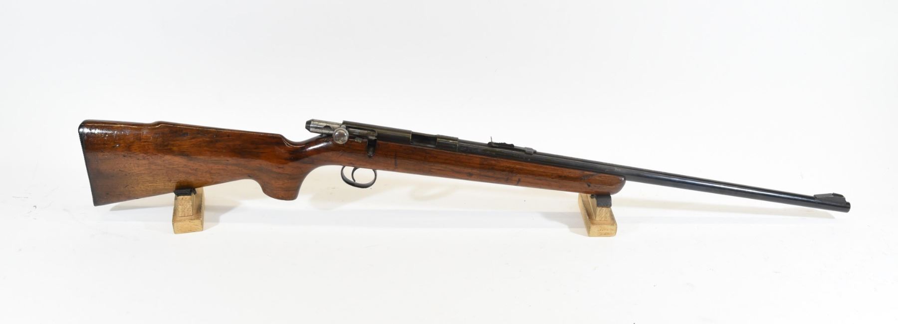 Non-restricted, bolt action, 22 LR, 22 1/2" barrel, SN 6823SA. Wood has numerous dents, marks and scratches, bluing is lightly pitted all over, bore excellent. Missing mag.