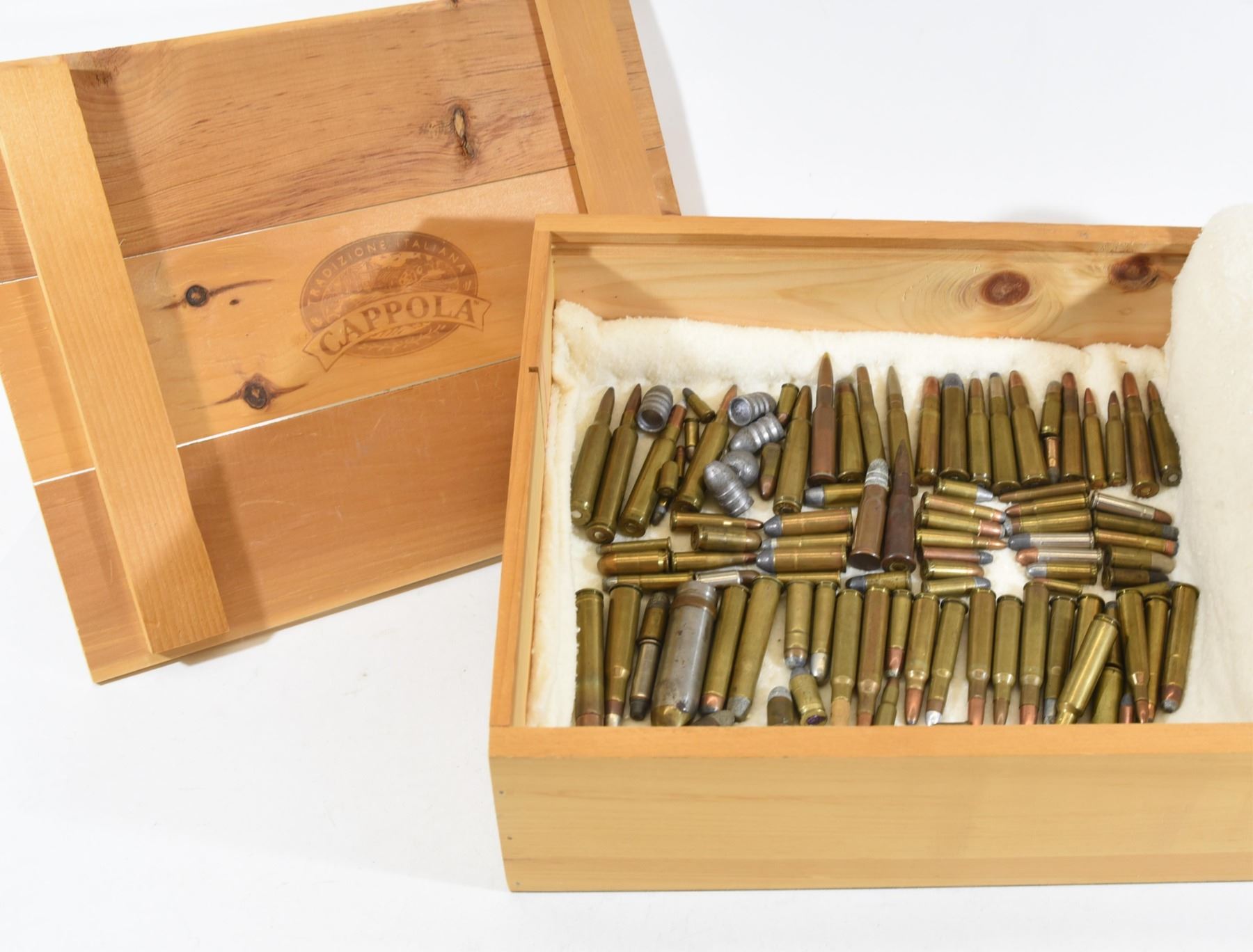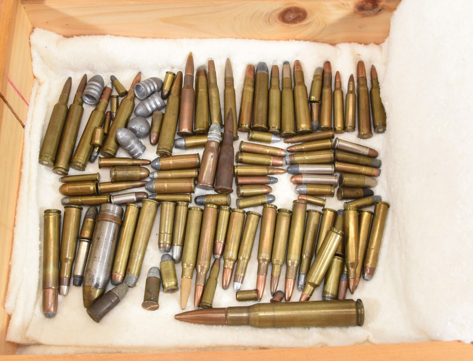 Various rifle and pistol rounds. Examples 50 cal military, 348 Win, 45-70 Win, 40-82 Win, 303 British dummy, 45-60 Win, 458 Win Mag, 44 RF, 221 Rem, 25-20 Win, 25-35 Win, 455 Colt, 45 Colt, and many more. Comes with wooden box.