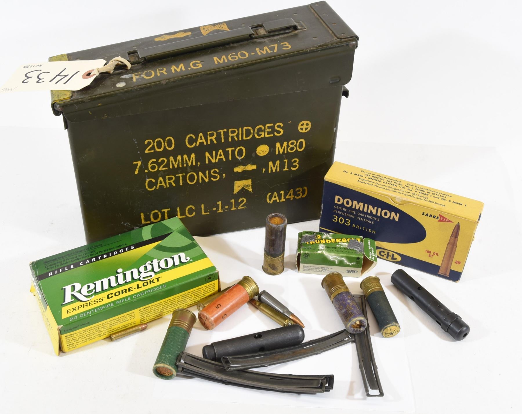 1 round 223 Rem, 1 round 22 Mag, 3 209 primers, 1 round 16 Ga, 4 rounds 12 Ga, 1 round 7.62 x 39, 1 round 30-30 Win, 20 rounds Remington 303 British, 11 rounds mixed 303 British, two cleaning kits for SKS and five stripper clips.