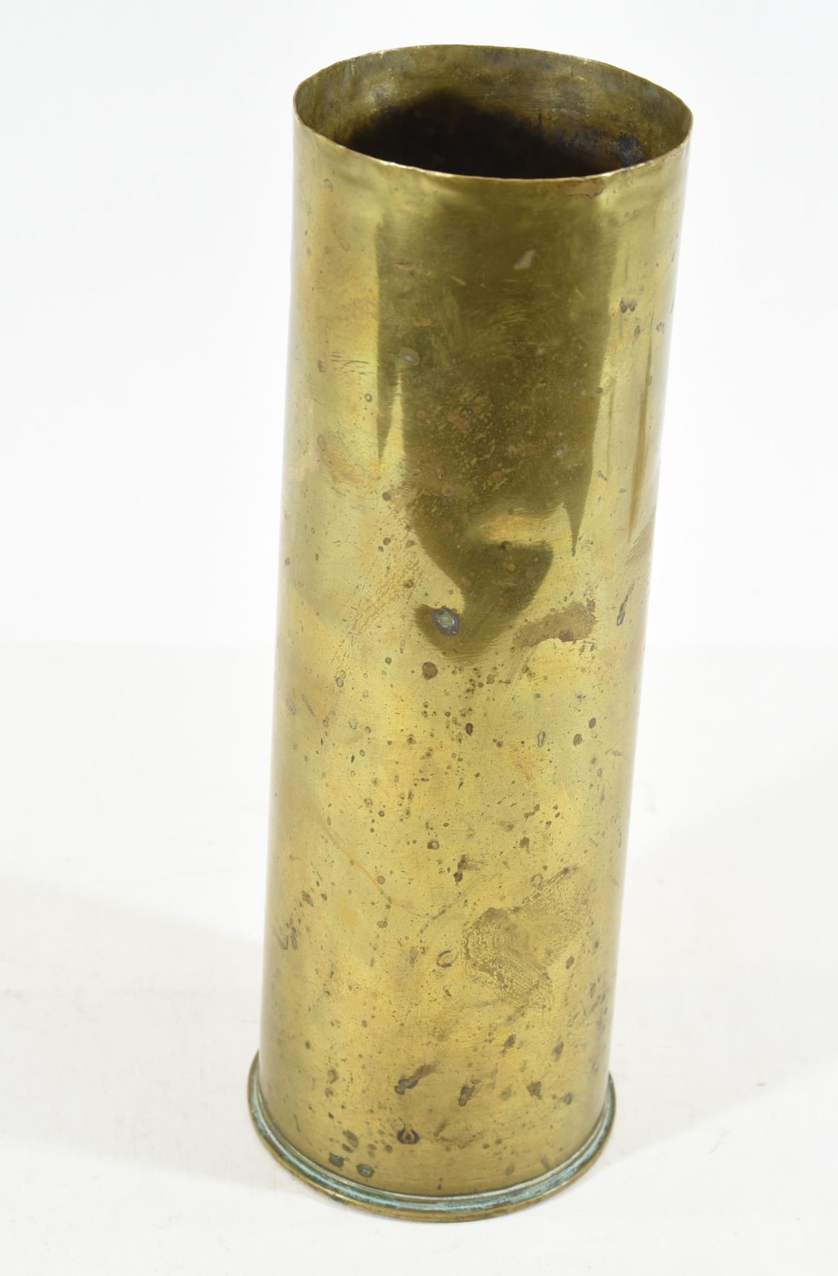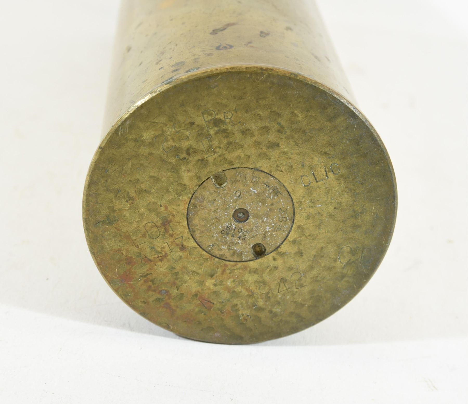 Complete empty brass case with primer insert. 29cm tall and 8.5cm at the mouth opening.