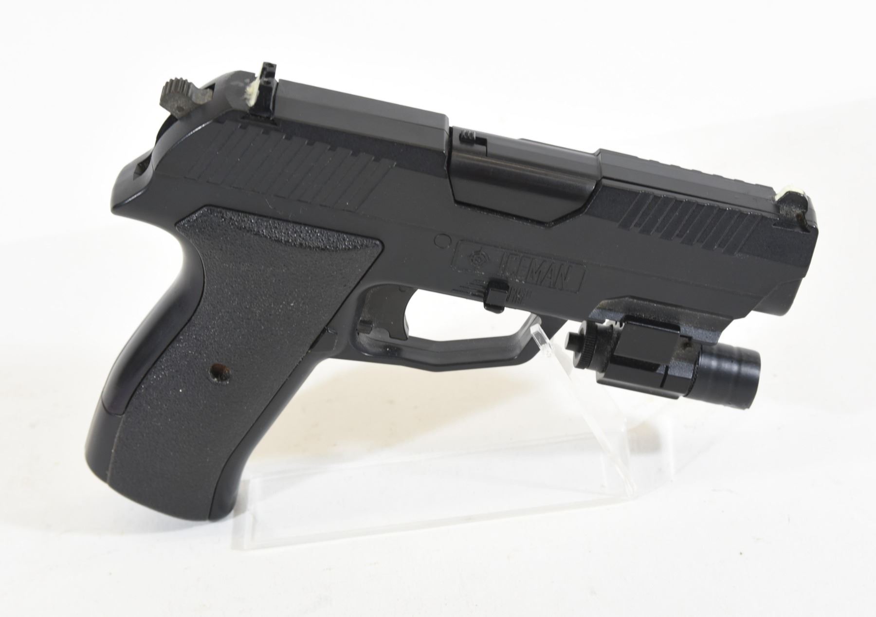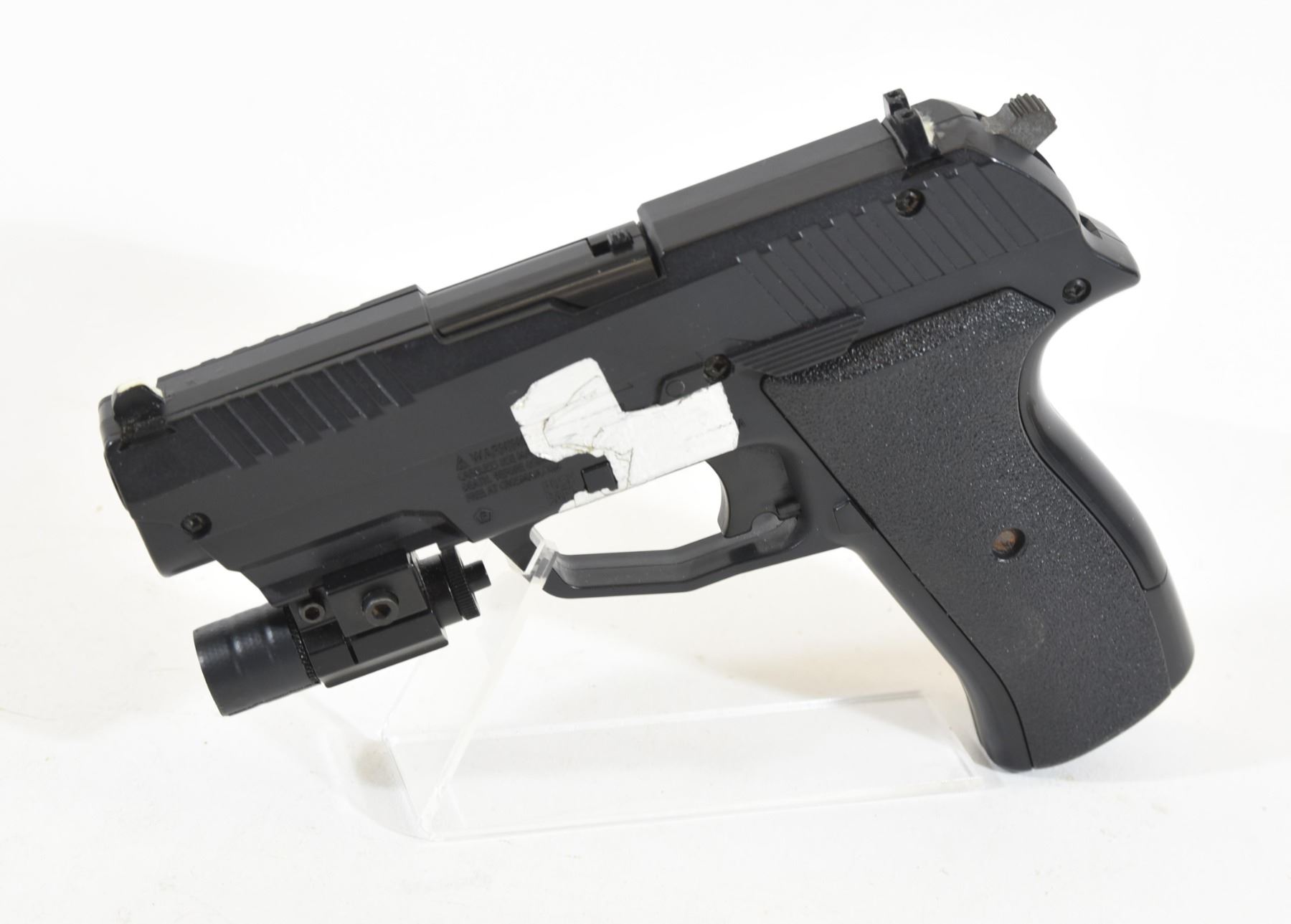No PAL required. Semi Auto .177 cal No Ser #. Finish is good. Has functional laser mounted. Includes 1 cylinder magazine.