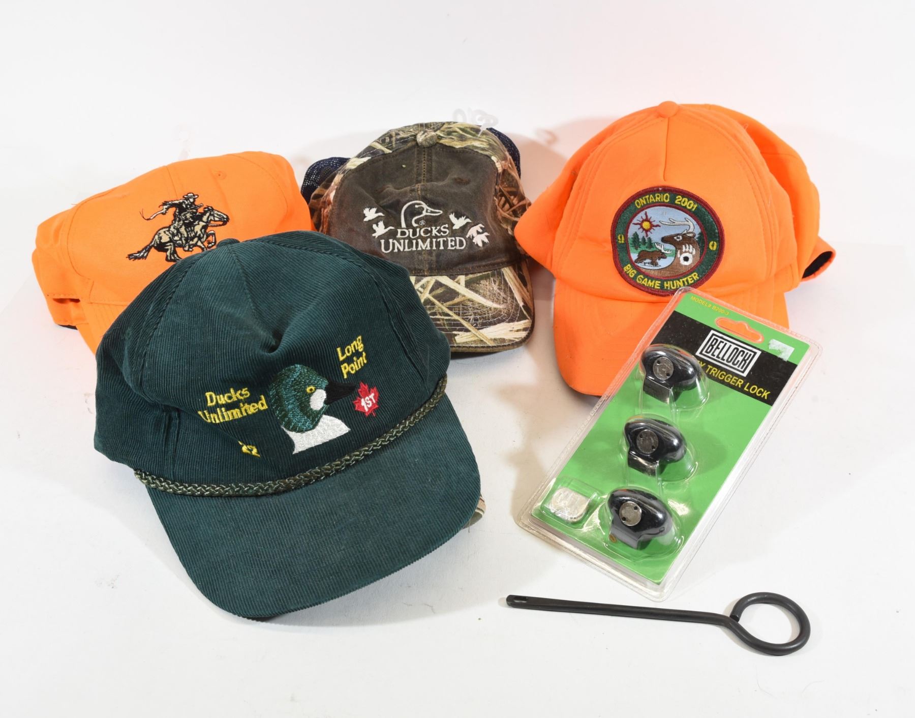 1) 9 various hats - 4 are new. 2) 3 trigger locks new in package. 3) Large caliber handgun cleaning rod.