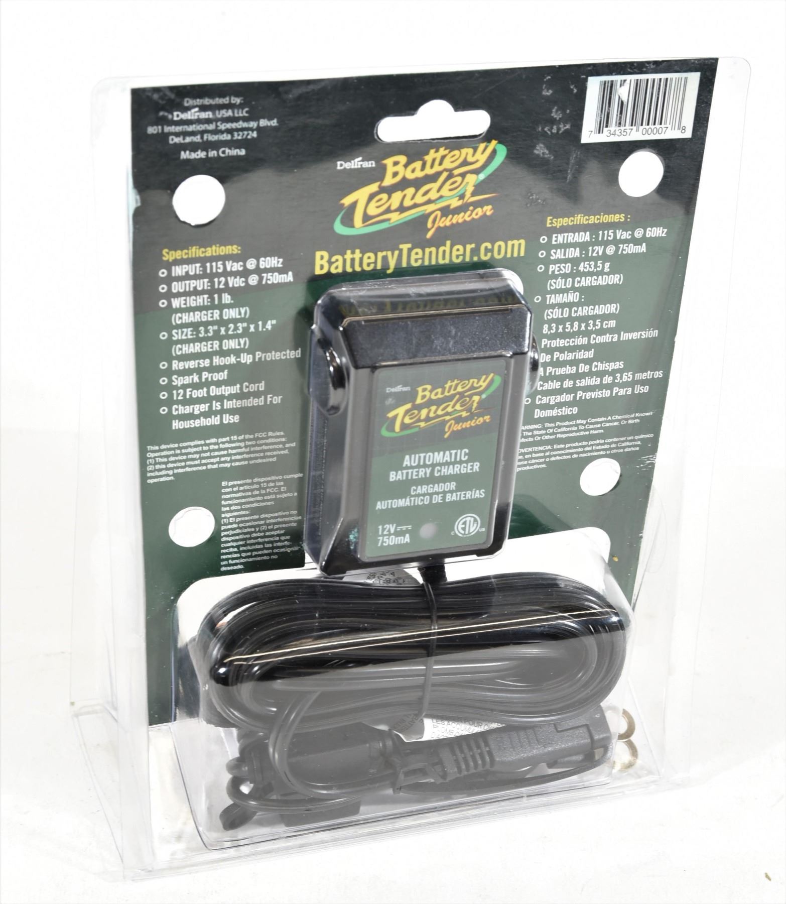 Auto battery charger, 12 volt at 750mA, new in package.
