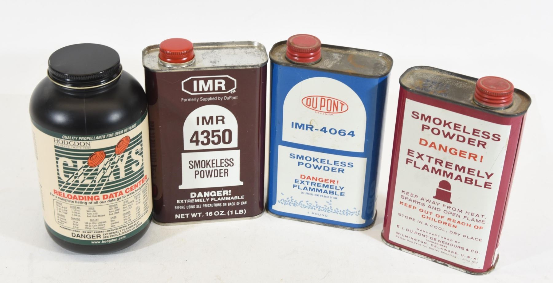 1) 1 pound IMR 4064. 2) 1 pound IMR 4350. 3) .8 of a pound IMR 4198. 4) 14 ounces Hodgon clays.