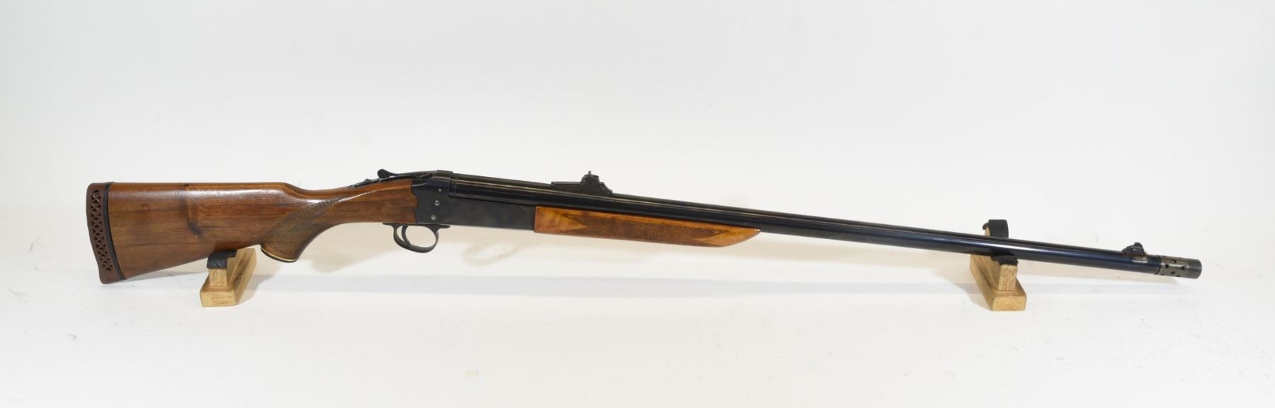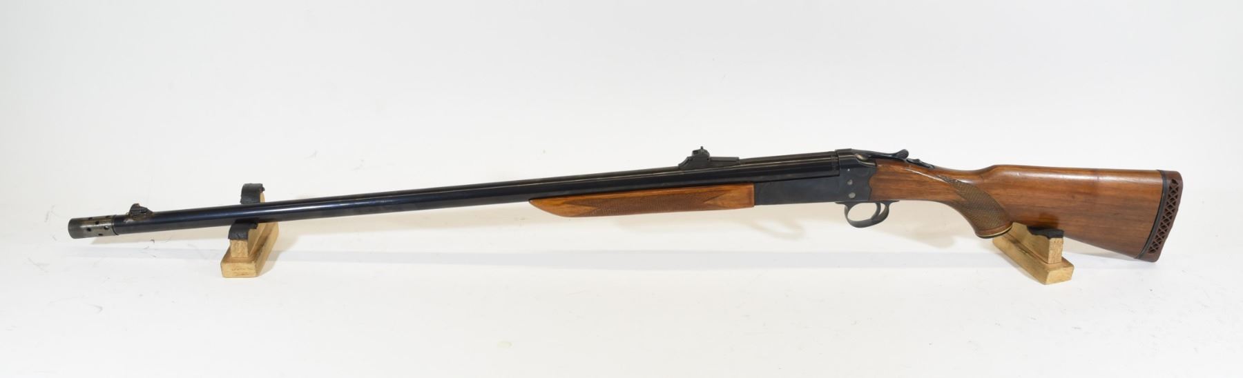 Non restricted, single shot, 12 gauge x 2 3/4", 32" barrel with a screw in ported xxfull choke, SN 27272. Wood has a few marks, bluing is fair, bore is good, has rifle sights.