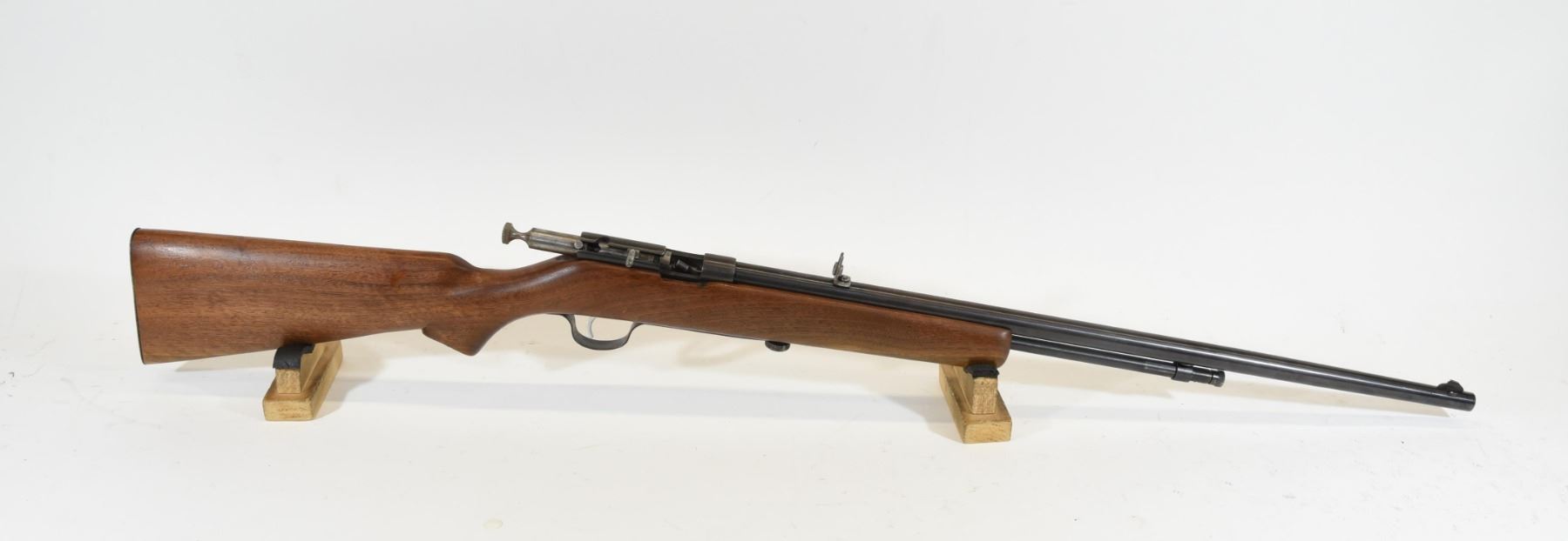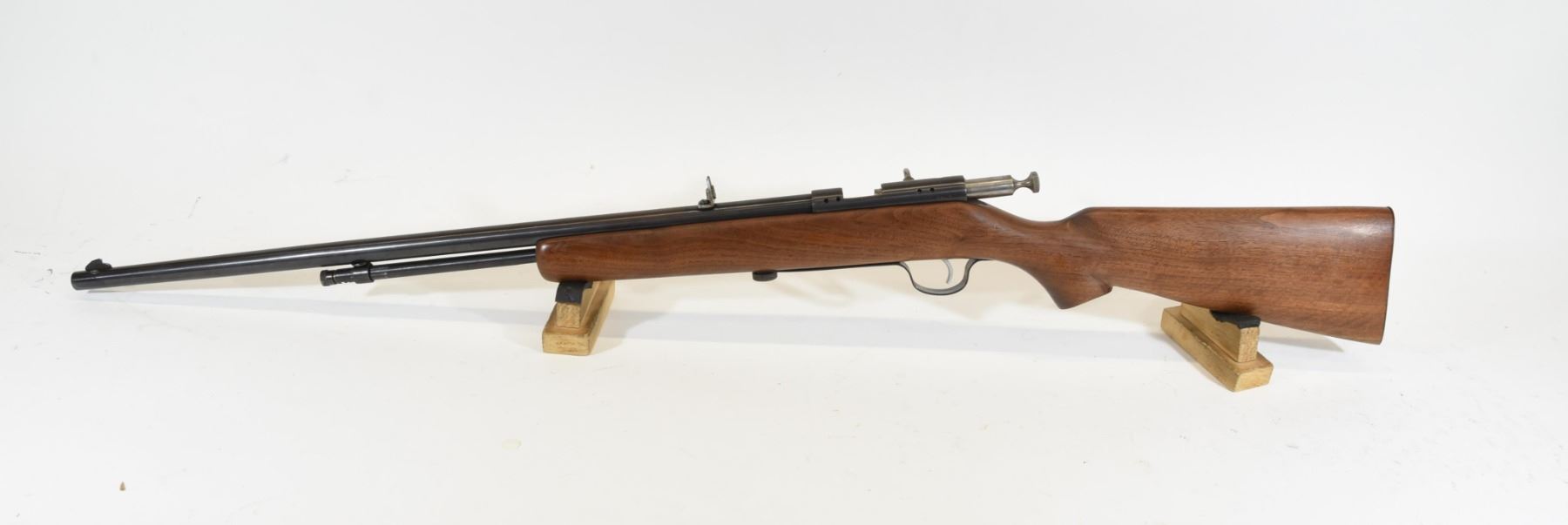 Non-restricted, bolt action, 22 caliber s,l,lr, 24" barrel, SN none. Wood is good, bluing is just starting to turn brown, bore is excellent, missing bolt knob, has a custom peep sight.