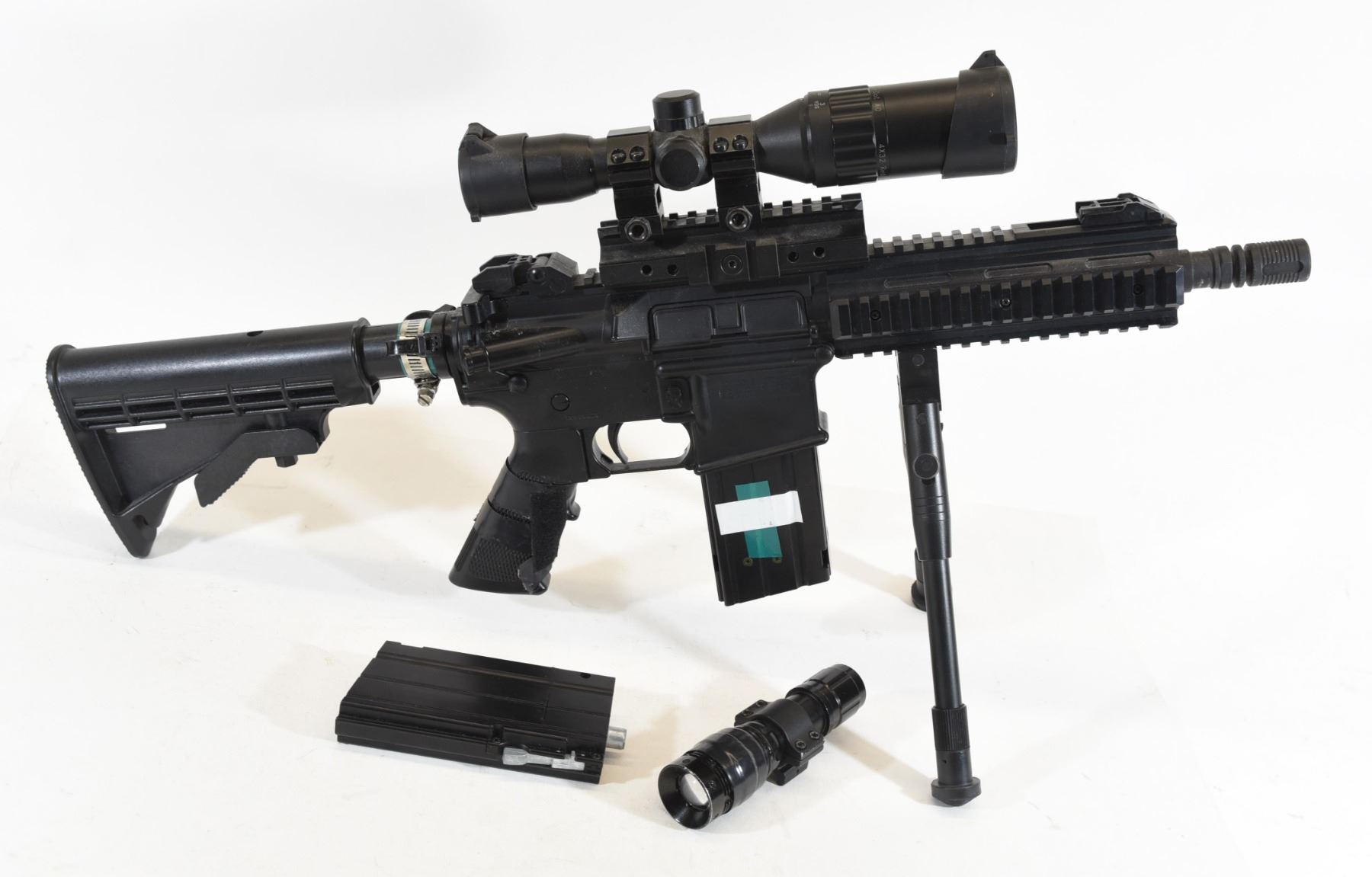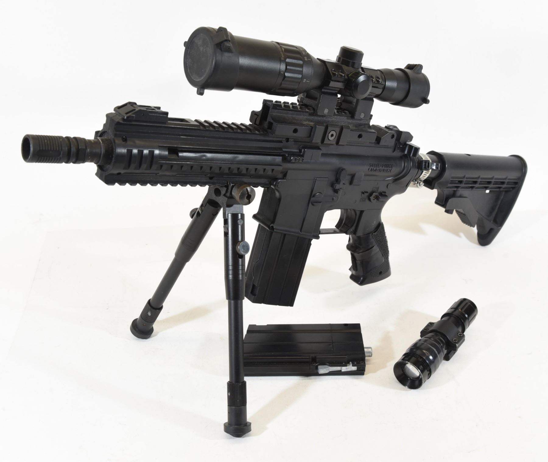 No PAL required. Has a 4 x 32 scope with a red or green reticle, 2 magazines and a bi-pod, also has a tactical flash light. BB Rifle (4.5mm AIRGUN NOT AIRSOFT). Houses 2x 12g CO2 cartridges in the magazine 300 round reservoir Semi-Auto and Burst Fire shooting modes Burst Fire up to 6 rounds at a time! 20mm accessory rails Flip-up front and rear sights FPS: 430 The new Steel Force is a 6-shot burst M4-style BB machinegun that makes shooters smile. This addition to the Umarex tactical line-up has practical applications for
