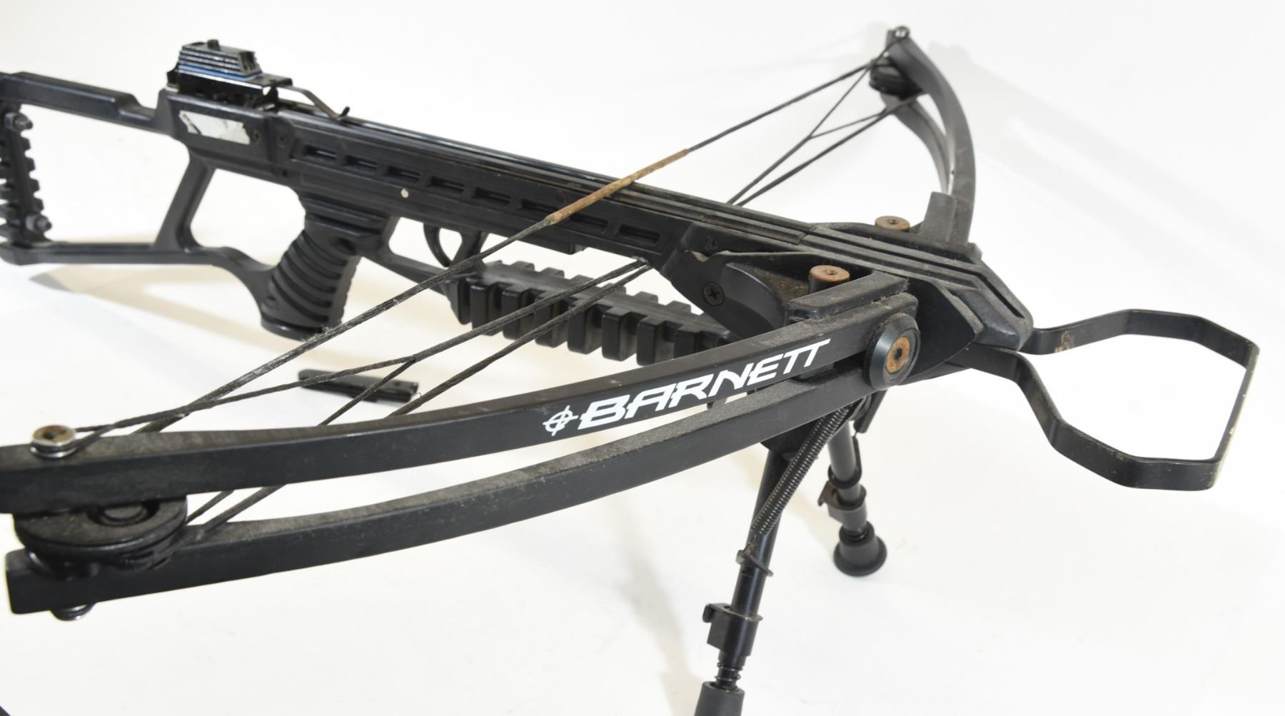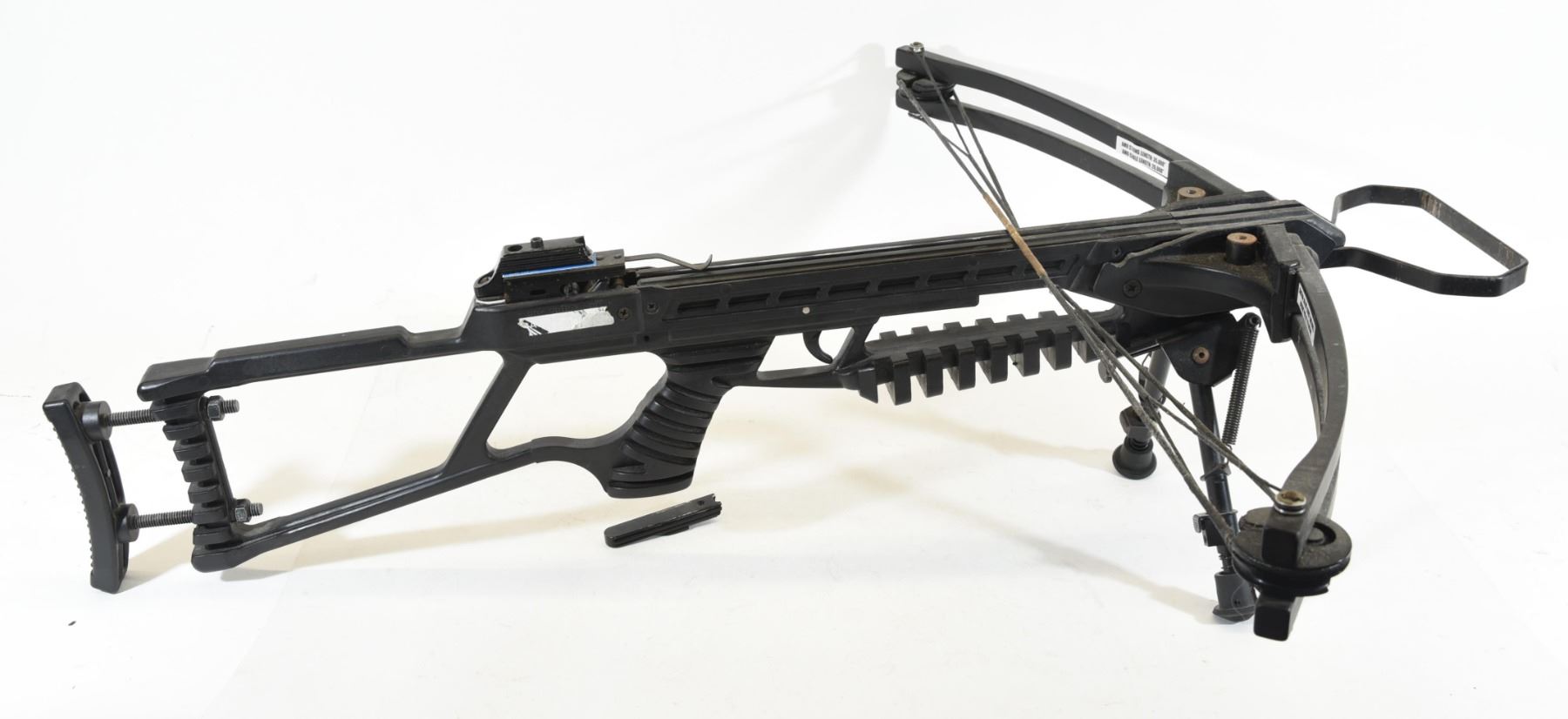150 pound draw weight, has a bi-pod, broken scope rail.