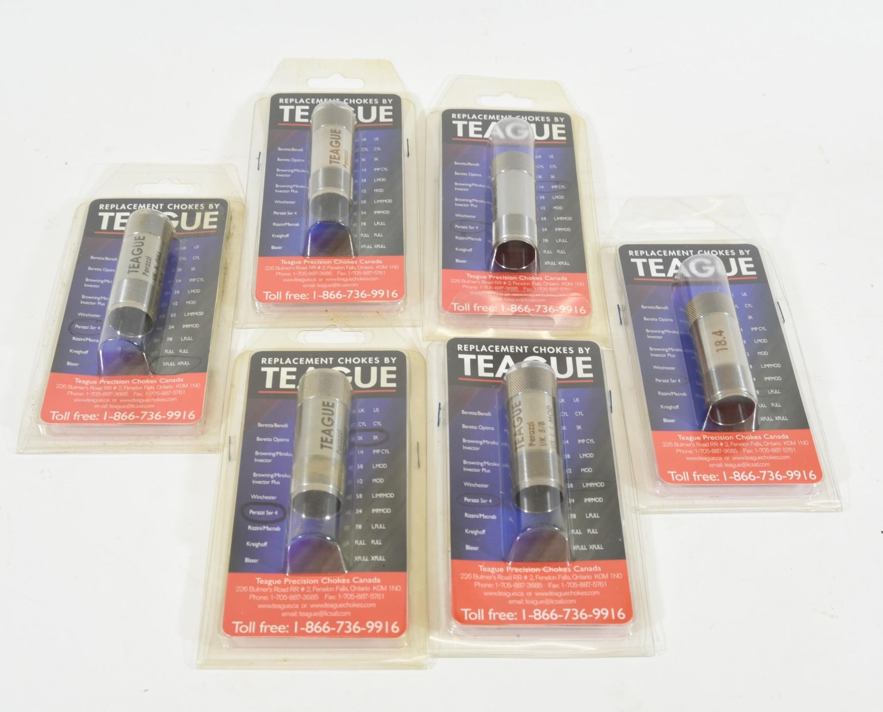 6 Teague chokes for a Perazzi ser-4, 1 improved cylinder, 1 light full, 1 light improved modified, 1 cylinder, 1 extra full, 1 skeet, new in package.