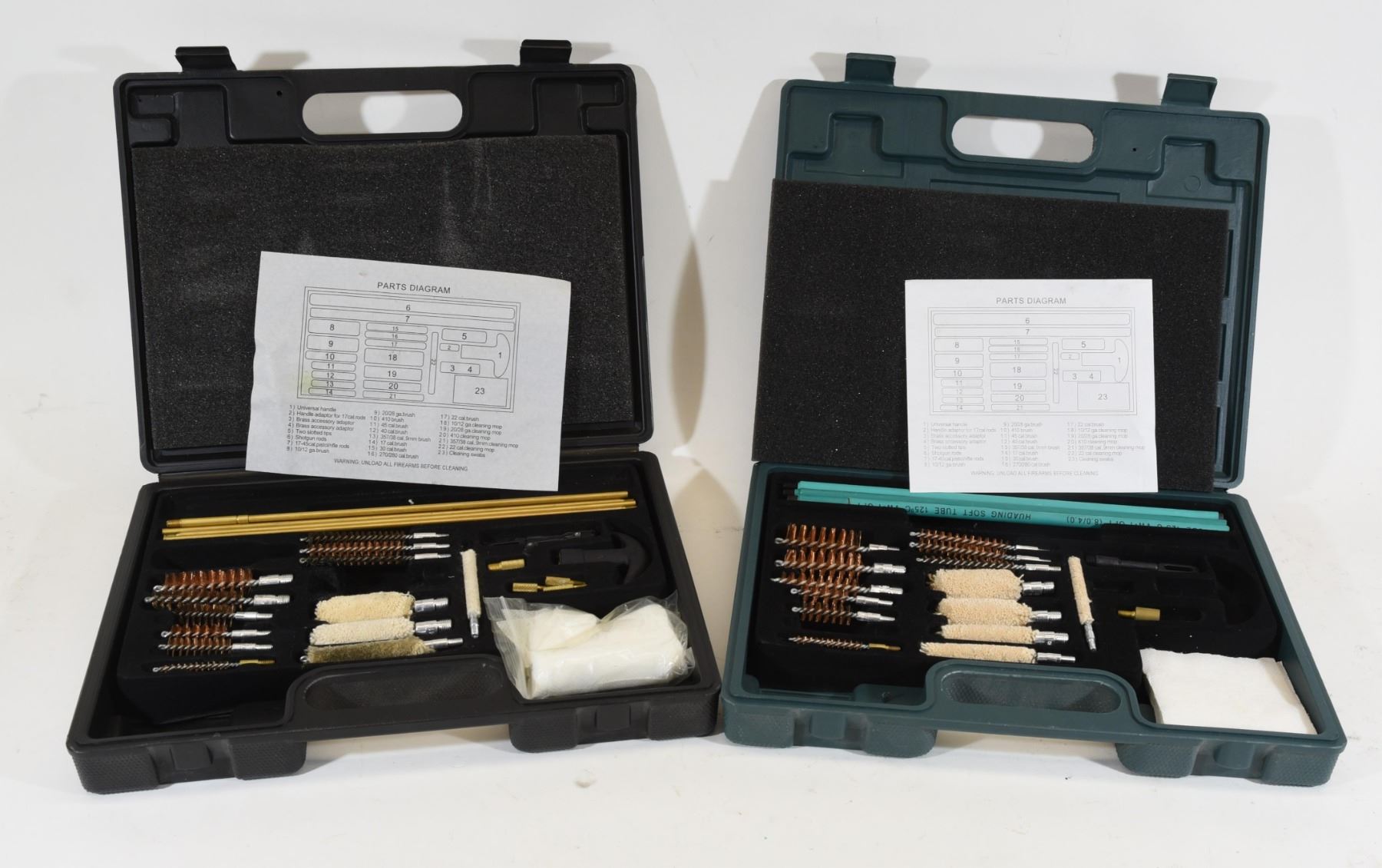 1) 22 caliber to 45 caliber and 410 to 10 gauge, missing 357, 9mm brush and tT handle for and rifle/handgun rods. 2) Same as above but missing shotgun rods, 10/12 gauge brush and 10/12 gauge mop.