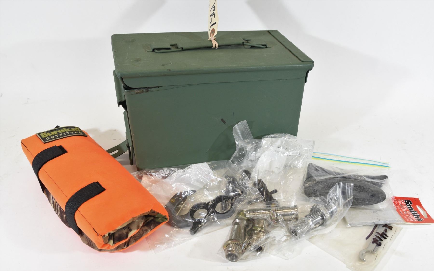 1) Metal ammo can. 2) Eureka hot seat. 3) 2 morgan butt stock pads not adjustable. 4) Gerber gut hook knife. 5) 3 choke keys 12 gauge. 6) Sharpening stone. 7) Miscellaneous dies.