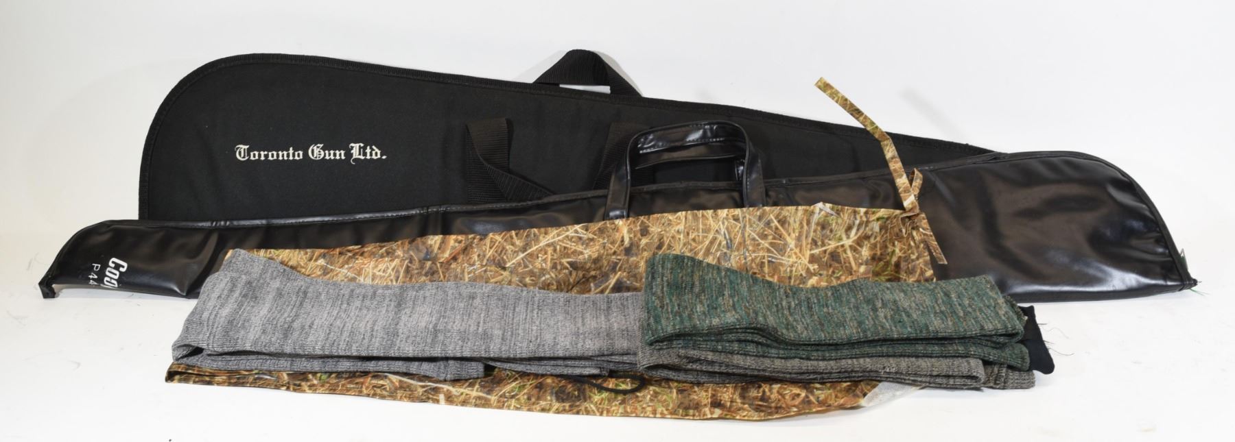 1) 4 gun socks. 2) 1 Camo light gun case. 3) Cooper 44 - 46" case. 4) Levy's 42" overall length gun case.