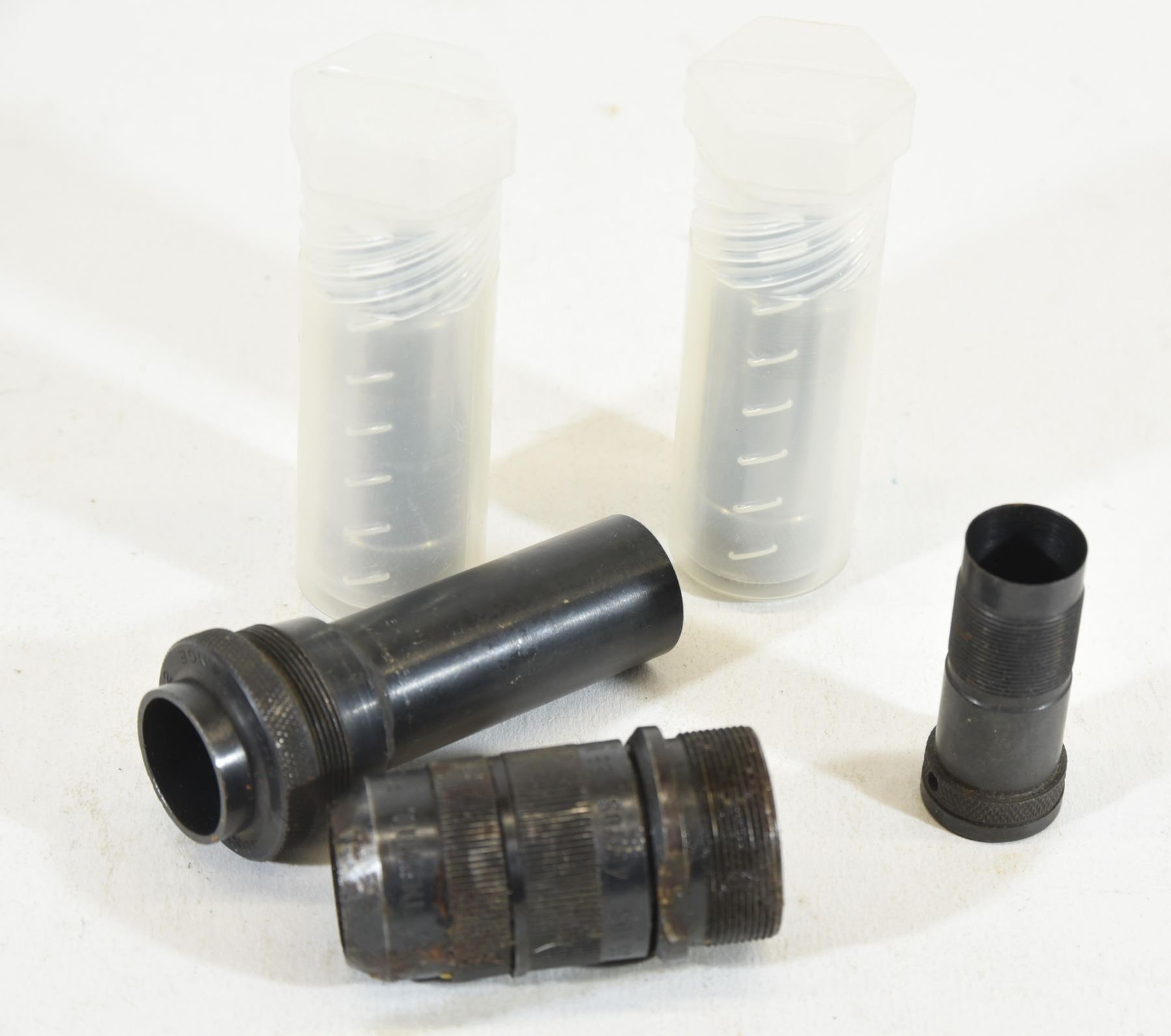 1) 20 gauge Winchoke x full. 2) New Teague Krieghoff cylinder, 12 gauge. 3) New Teague Krieghoff improved cylinder, 12 gauge. 4) 2 used Cutts chokes, 12 gauge.