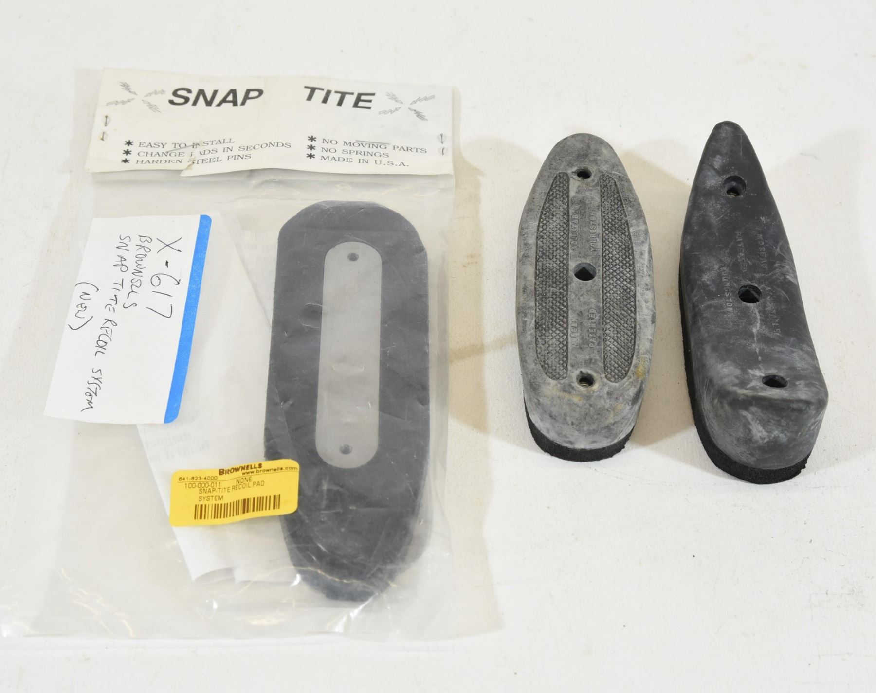 1) Morgan flat recoil pad - new. 2) Morgan curved recoil pad - new. 3) Brownells snap tite recoil system.