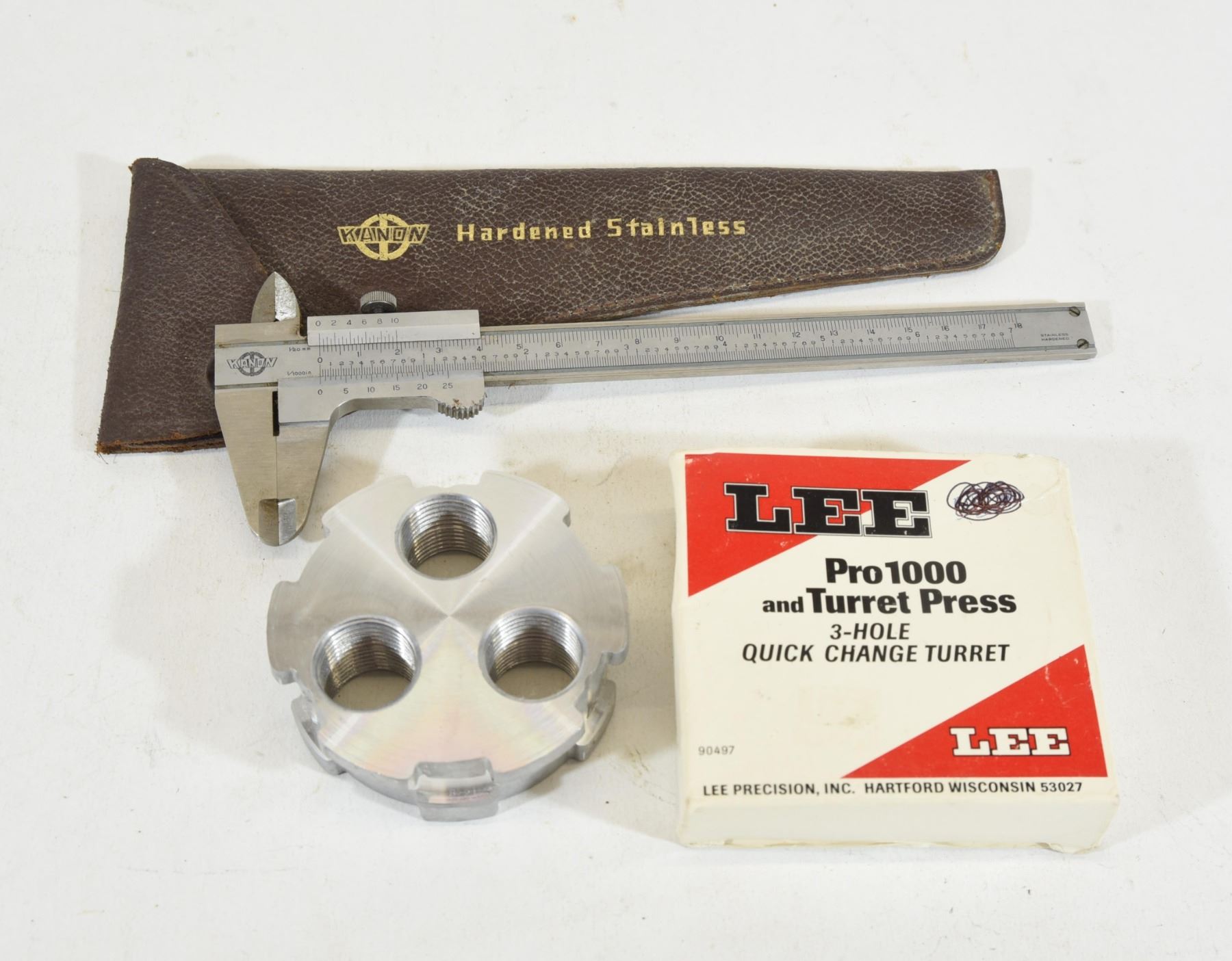 1) Kanon calipers. 2) Lee Pro 1000 & turret press 3 hole turret.