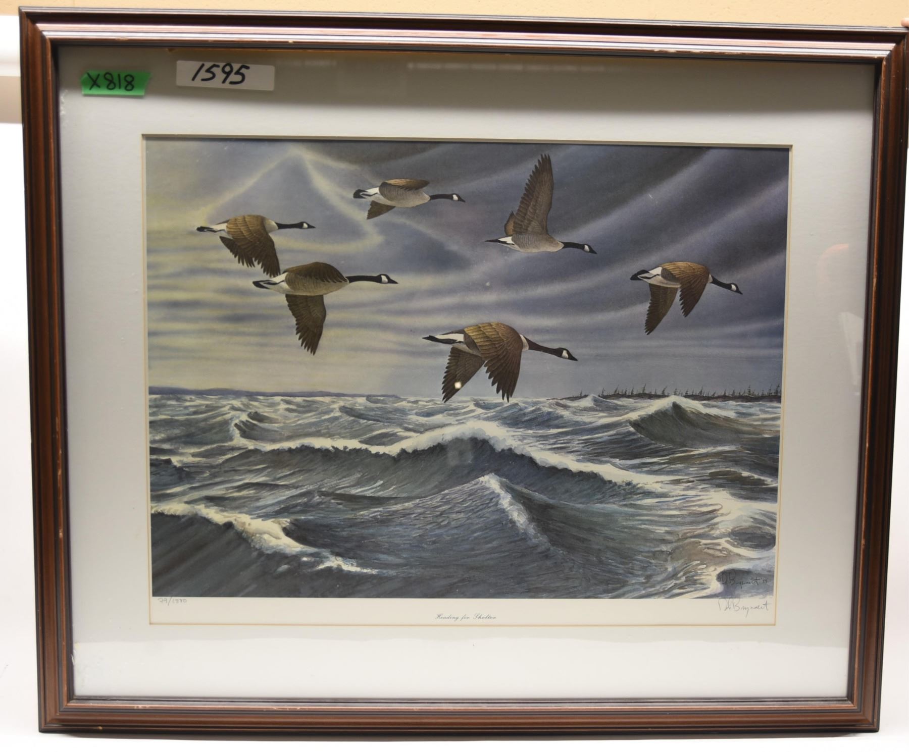 Canada Geese Heading for Shelter by D. Brynaert, 1983. 79/1000. Frame measures 37" x 30 1/2" with a few marks. WILL NOT SHIP. MUST PICK UP.