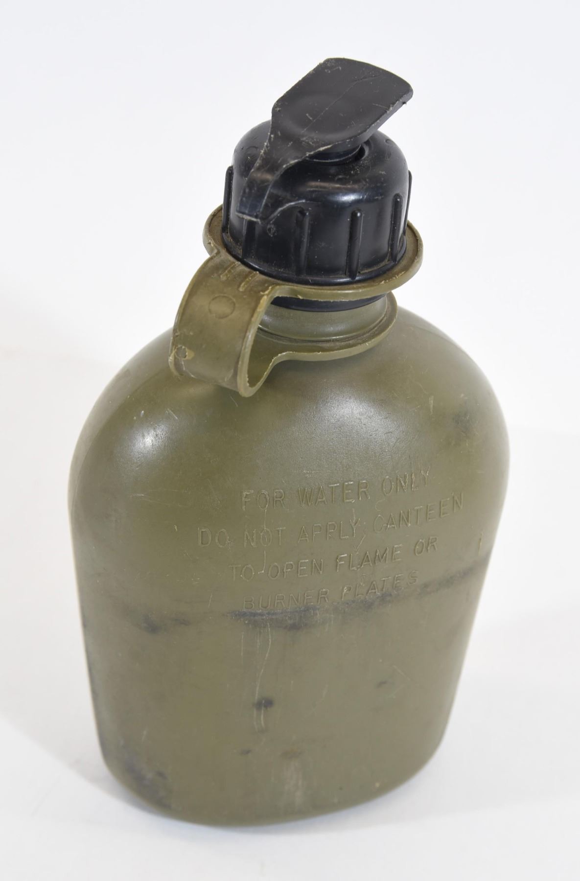 US Military 1-quart canteen This canteen has the NBC Cap that can be unscrewed like a regular lid and a valve at the in the cap so you can hook a drinking line from a mask if necessary. Lightweight and made of a heavy durable crush resistant plastic. Colour is olive with black cap. Original U.S. military issue.