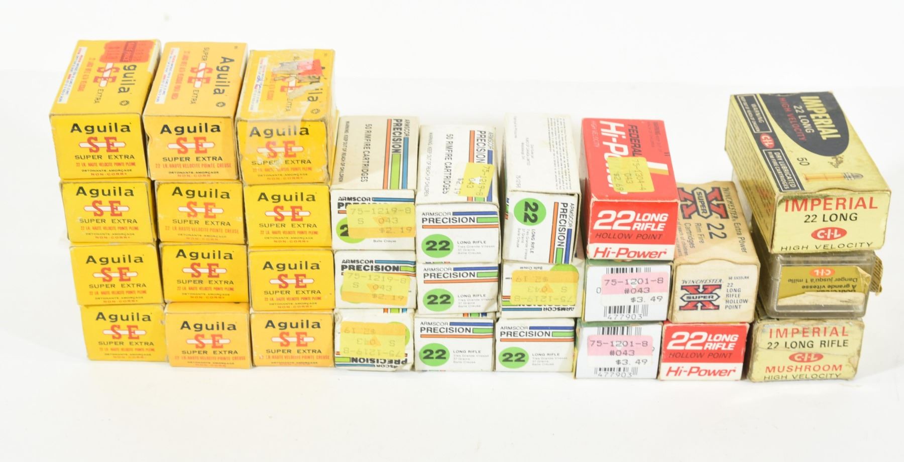 576 rounds Aguila, 100 rounds Federal, 100 rounds Remington Yellow Jacket, 450 rounds Armscor Precision, 50 rounds Winchester Super X, 145 rounds Imperial.