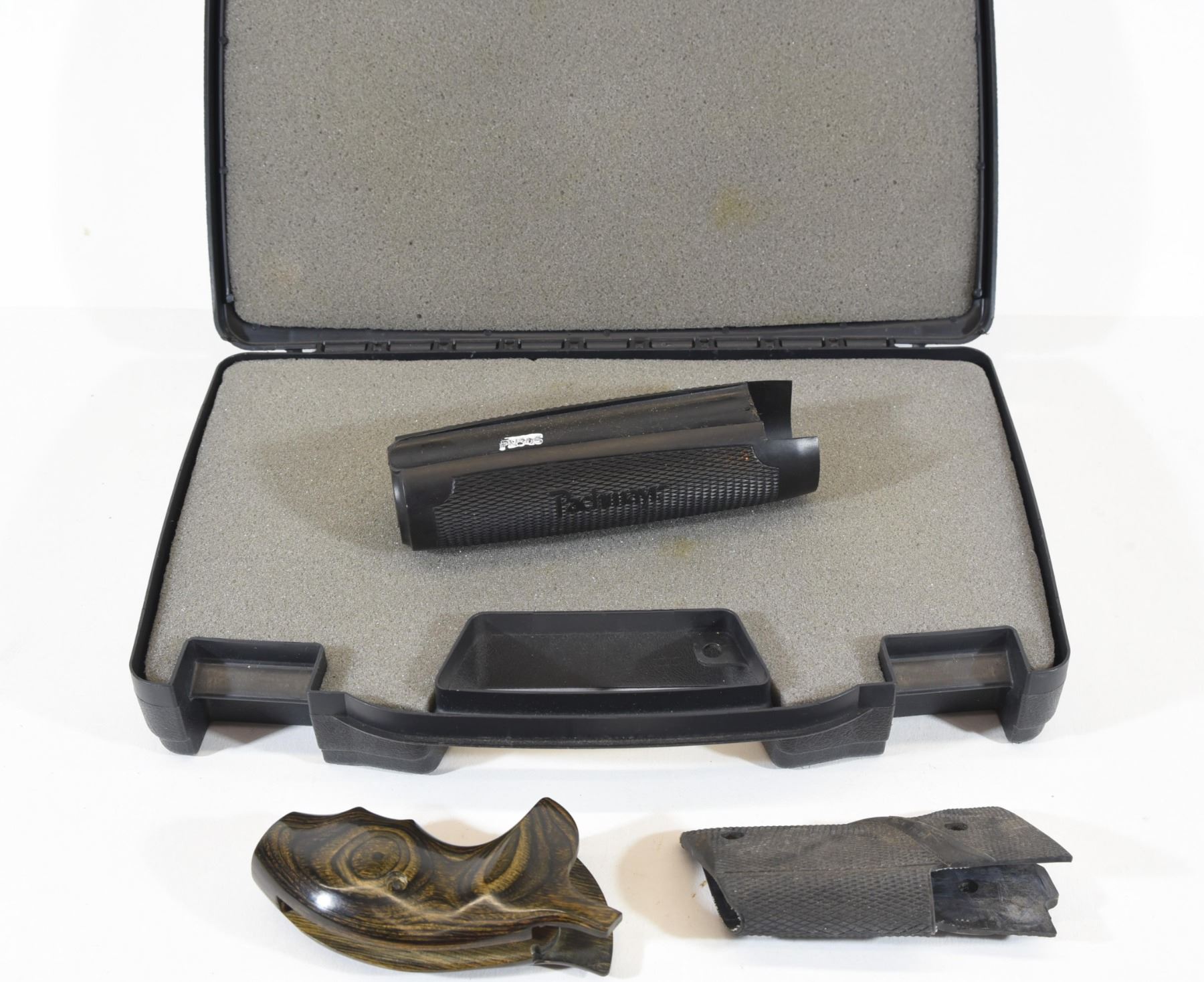1) Smith & Wesson 59 Pachmayr grips. 2) Set of Ajax custom grips. Very small chip under screw hole. 3) Pachmayr fore end for unknown shotgun. 4) Plano protector handgun case.