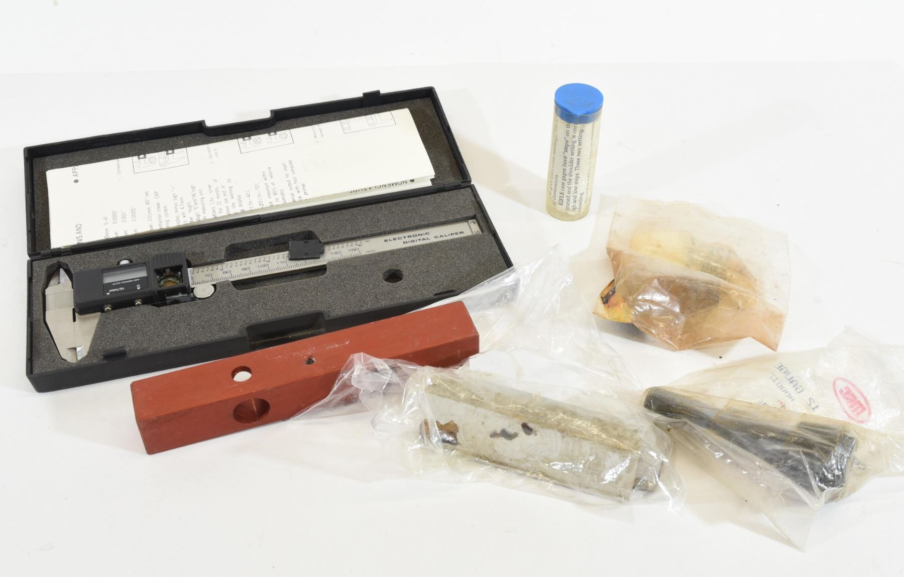1) Charge bar 502 118. 2) 2 Dillon prec. 308 head space/case gauge. 3) MEC collet for 12 gauge #808012 4) Aluminum vise jaws. 5) Electric display calipers, no battery, unknown functionality.