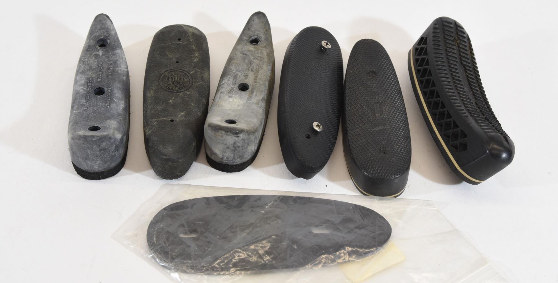 1) 2 Beretta recoil pads. 2) 2 Morgan curved recoil pads. 3) 2 White Line Pachmayr recoil pads, 1 flat, 1 curved. 4) 1 Brownells 1/4 - 1/16 positive pitch spacer.