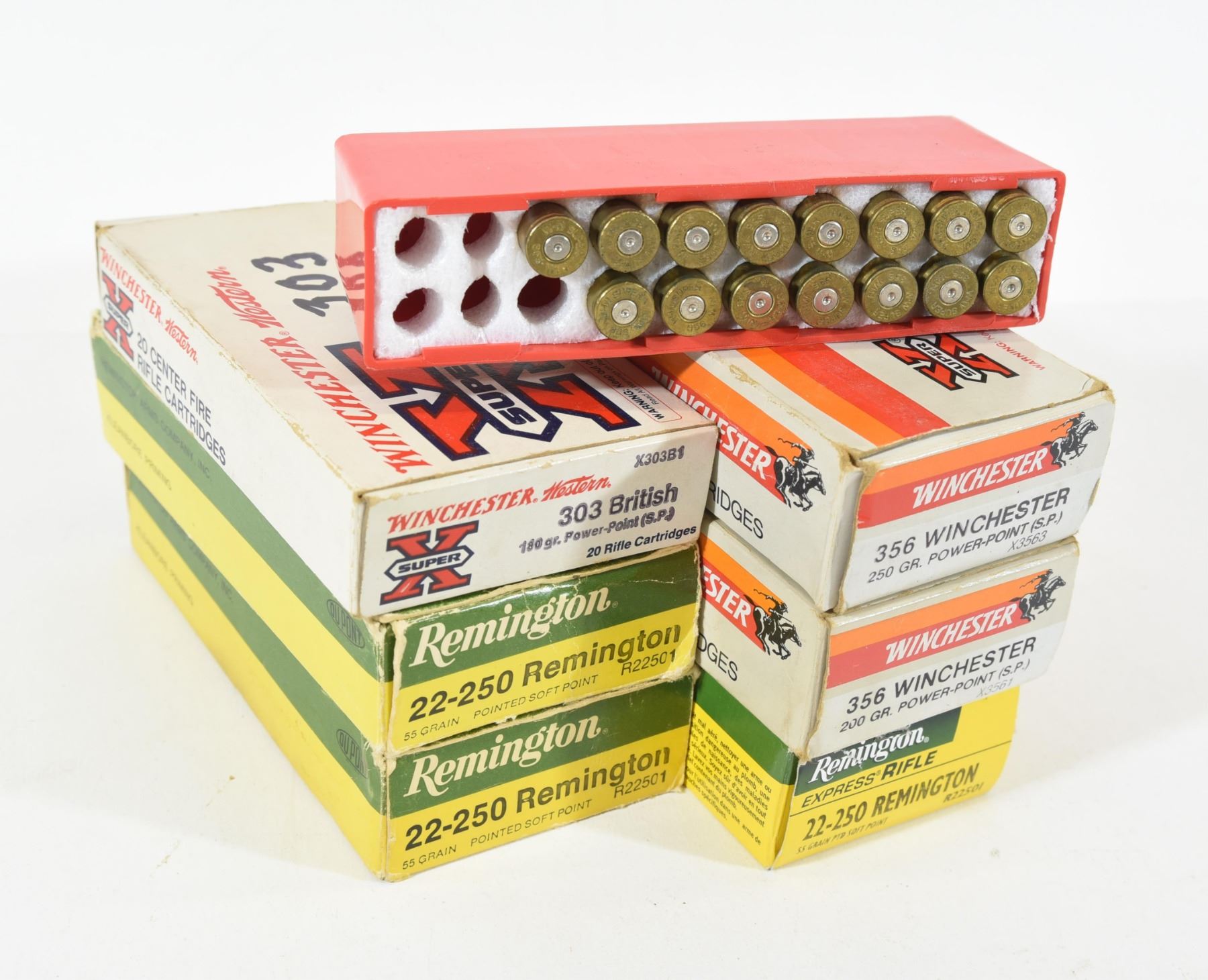20 rounds Remington 22-250 Rem 55grn, 20 rounds Winchester 303 British 180grn, 40 pieces 22-250 brass, 54 pieces 356 Win brass.