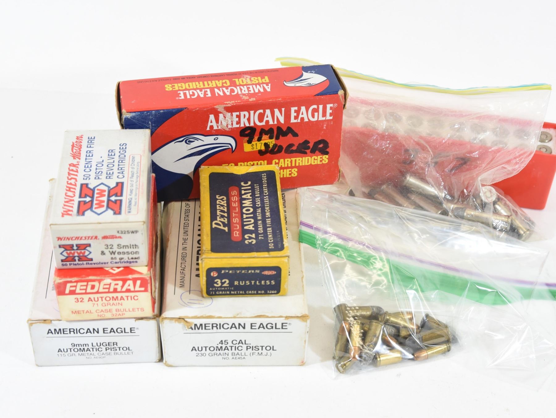 49 rounds Federal 32 Auto, 50 rounds Winchester 32 S&W, 11 rounds Peters 32 Auto, 13 rounds American Eagle 9mm Luger, 11 rounds American Eagle 45 ACP, 50 rounds American Eagle 9mm Luger, 15 rounds Remington 357 Magnum, 17 rounds miscellaneous.