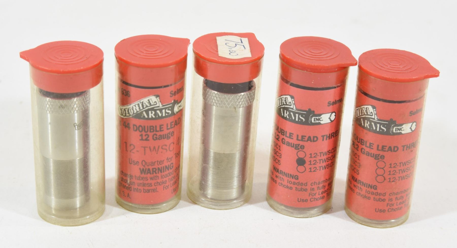 All new Colonial Arms 12 gauge thinwall chokes, 774 x 44 double lead thread. 1) Skeet 1. 2) IMD. 3) Cylinder. 4) 2 Modified.