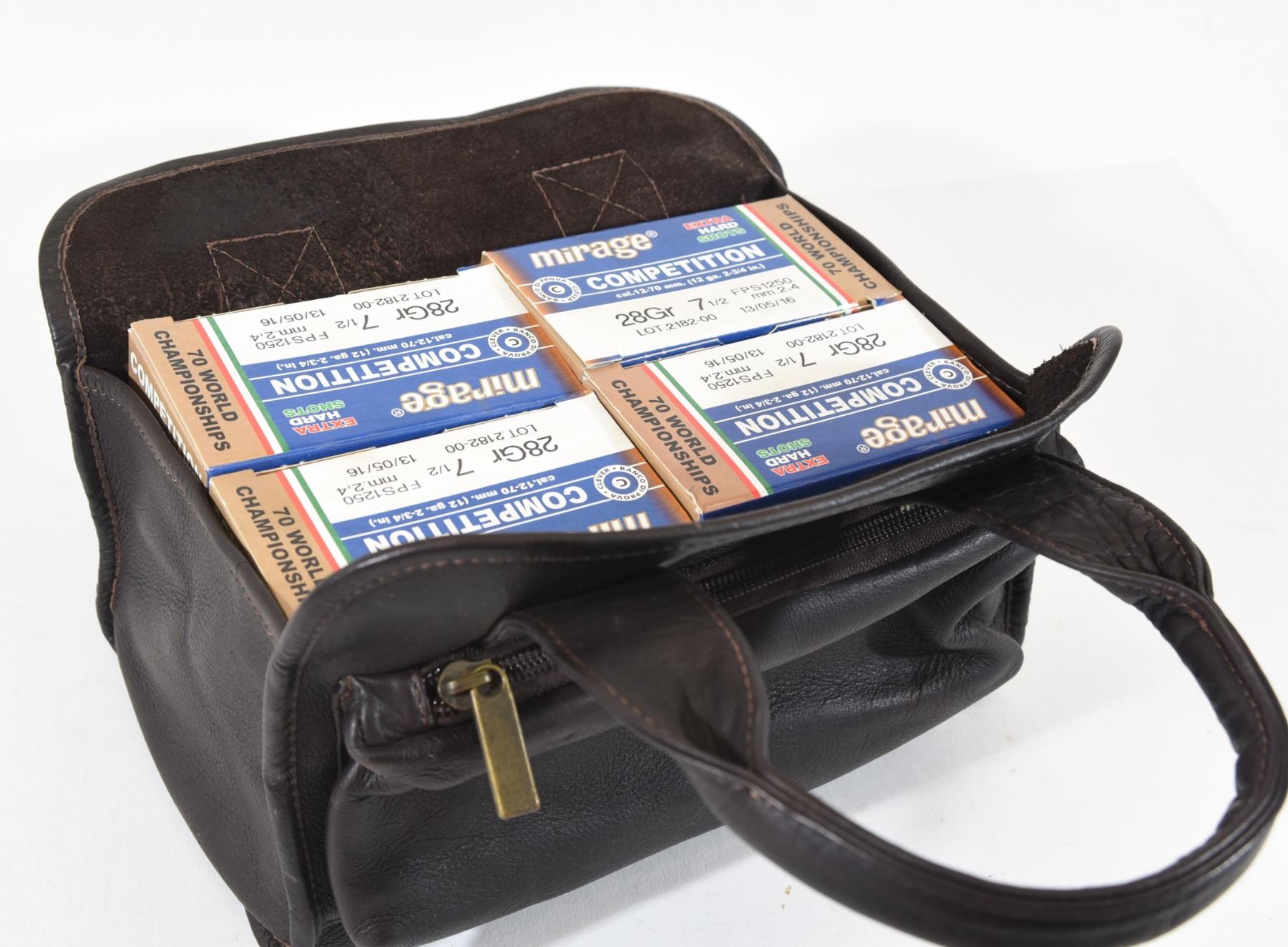 100 rounds ( 4 boxes) of 12 gauge x 2 3/4" #7 1/2 shells in a Wild-Hare brown leather 4-box carrier.