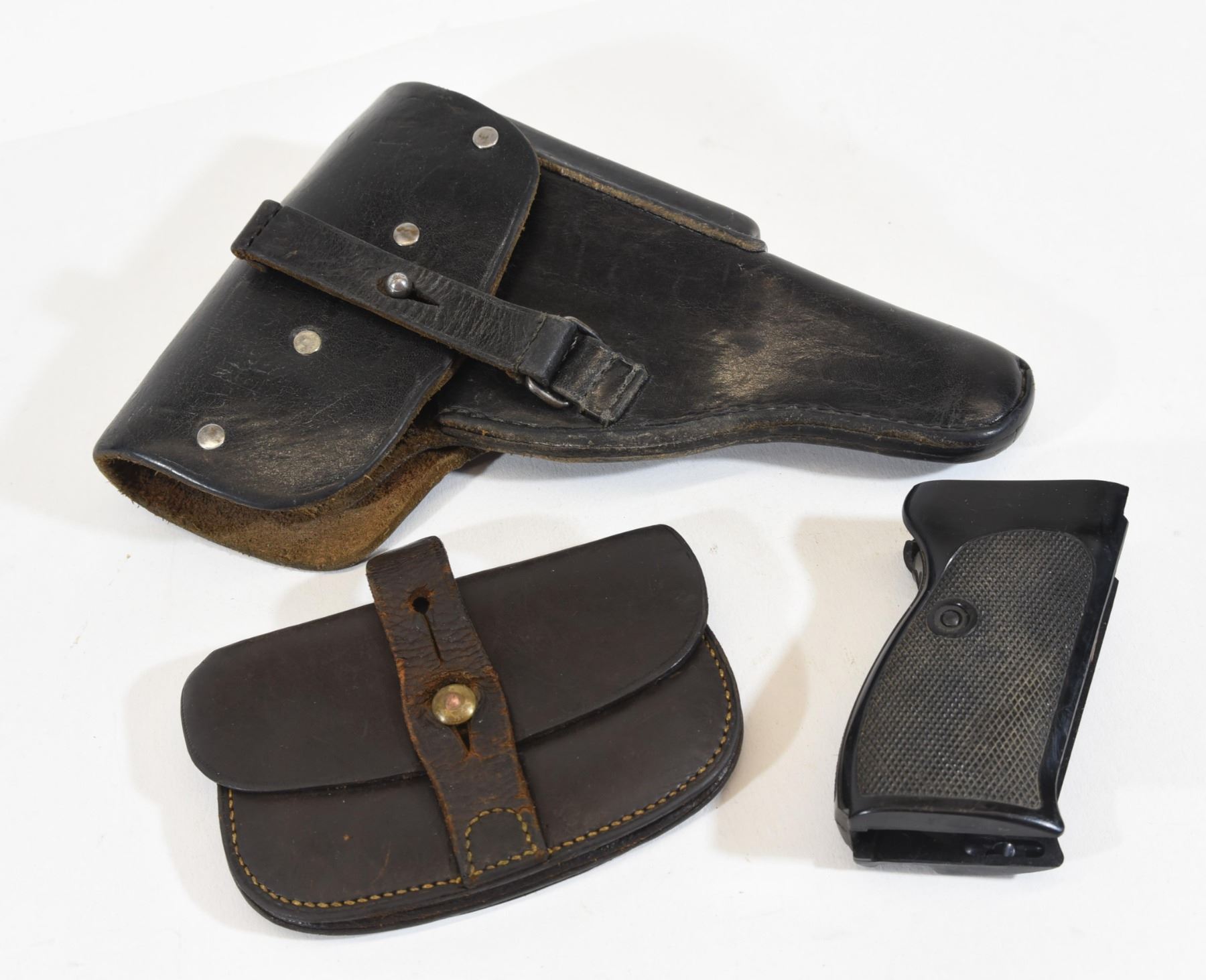 1) Black leather holster. 2) Set of black plastic grips. 3) Brown leather pouch.