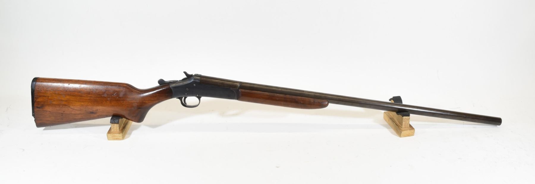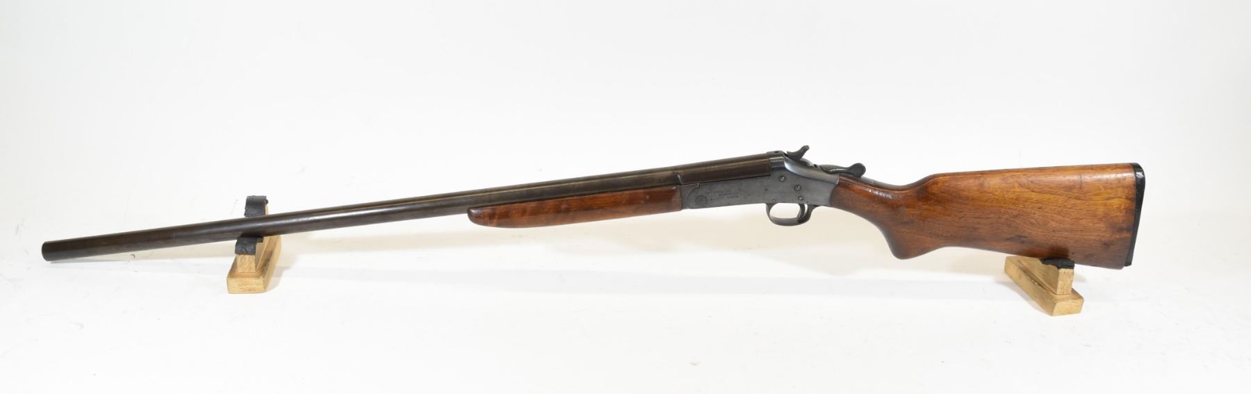 Non-restricted, single shot, 12 Ga x 2 3/4", 29" barrel with fixed open choke, SN CM89954. Wood solid with repair in forearm, bluing is brown on barrel, bore excellent. Butt plate broken. Long Branch Ontario.
