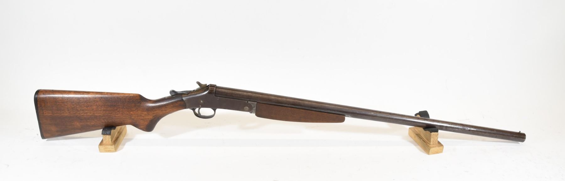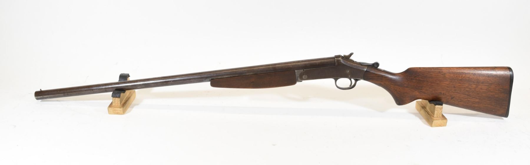 Non-restricted, single shot, 12 Ga, 28" barrel with fixed open choke, SN A890670. Wood has some dents and a crack behind lower tang, forearm not original, bluing is brown, bore excellent.