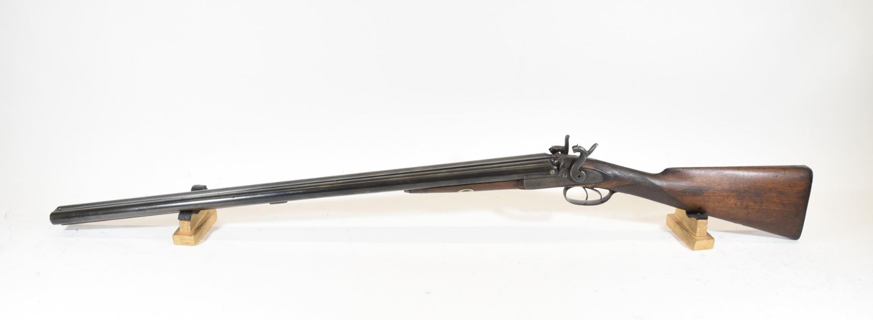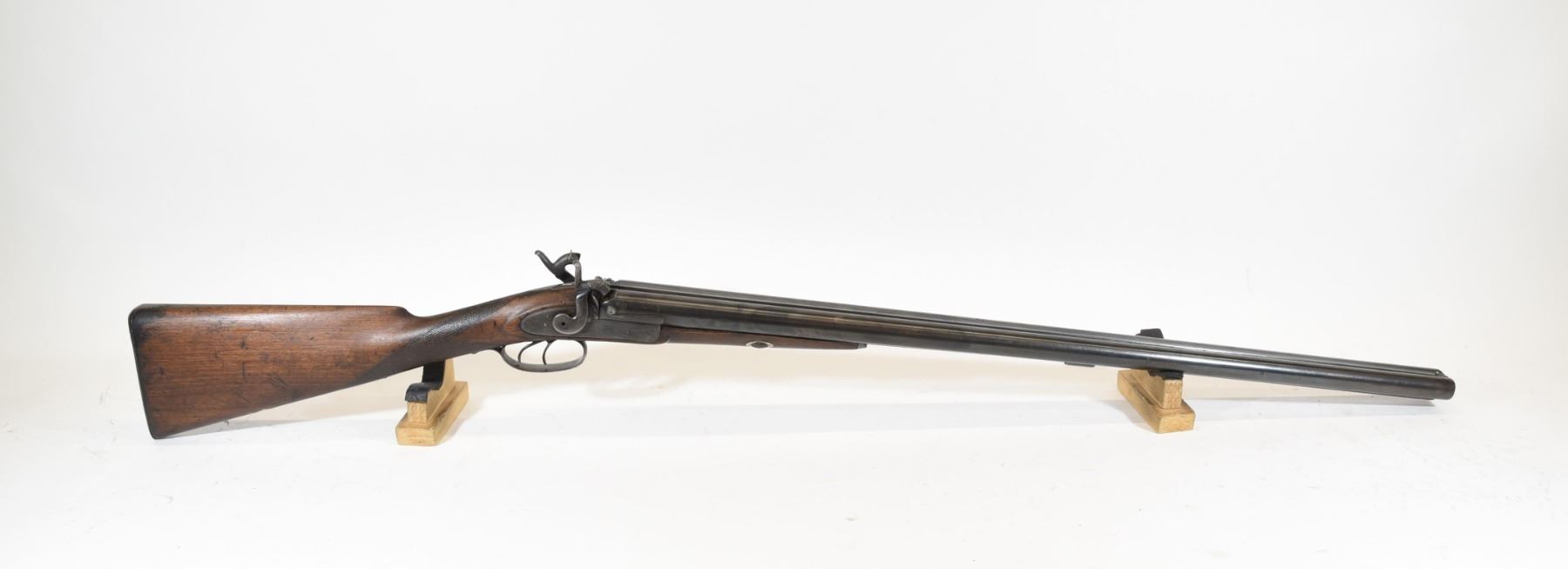 Non-restricted, multi barrel, 12 Ga percussion, 31" Damascus barrels, SN 25490. Wood has dents, chips and scratches, bluing cold blued with pitting evident, bores pitted. Left hammer does not function, right nipple broken off.