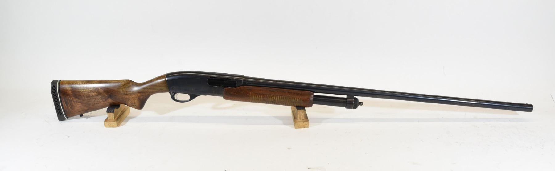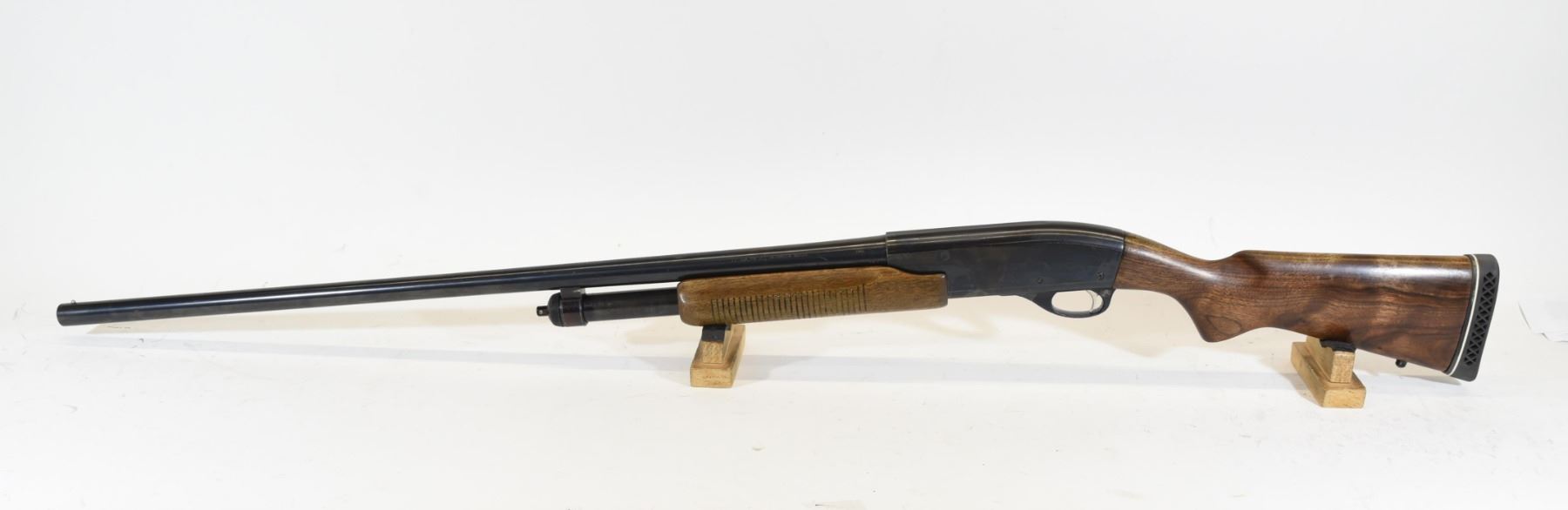 Non-restricted, pump action, 12Ga x 2 3/4", 30" barrel with fixed full choke, SN 712988V. Wood refinished, bluing is turning grey, bore excellent.