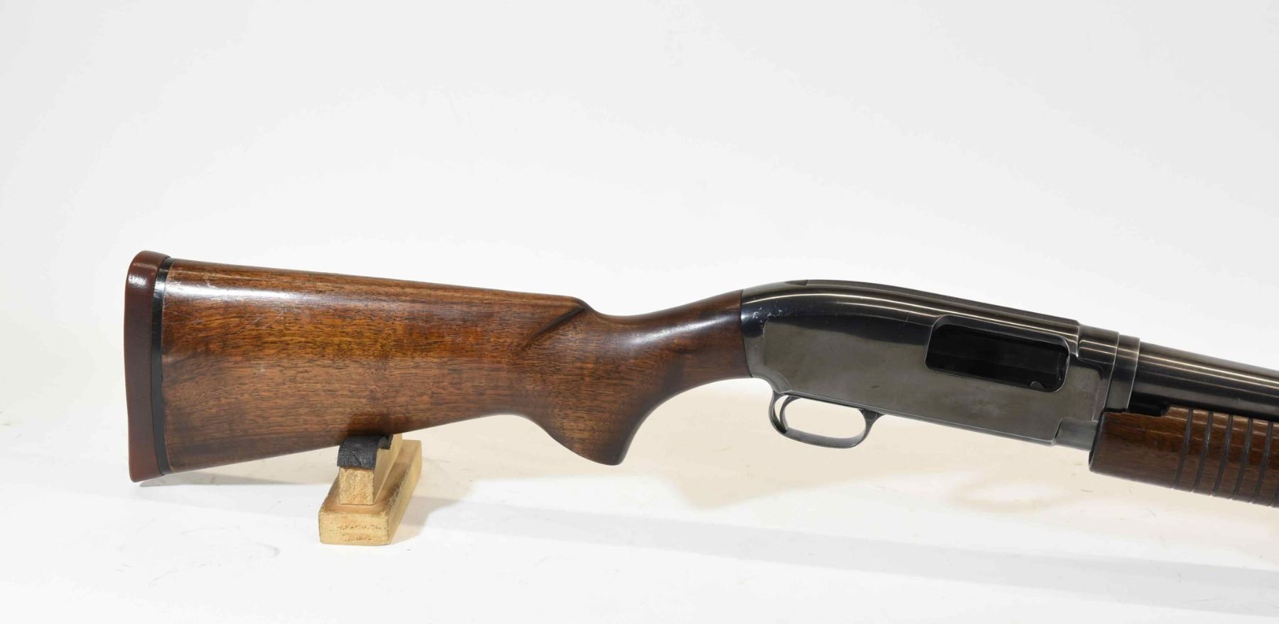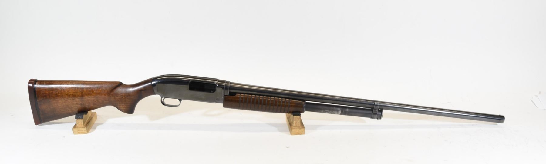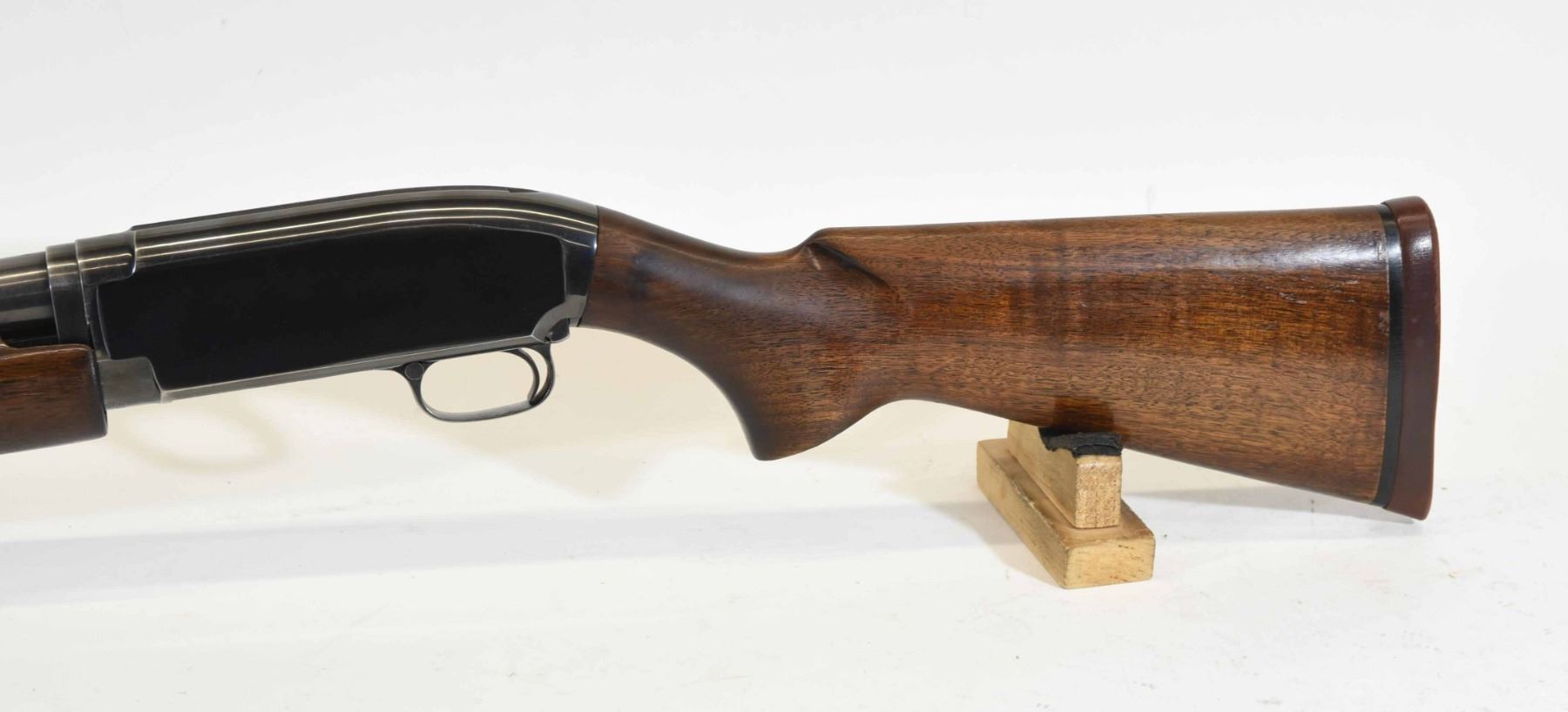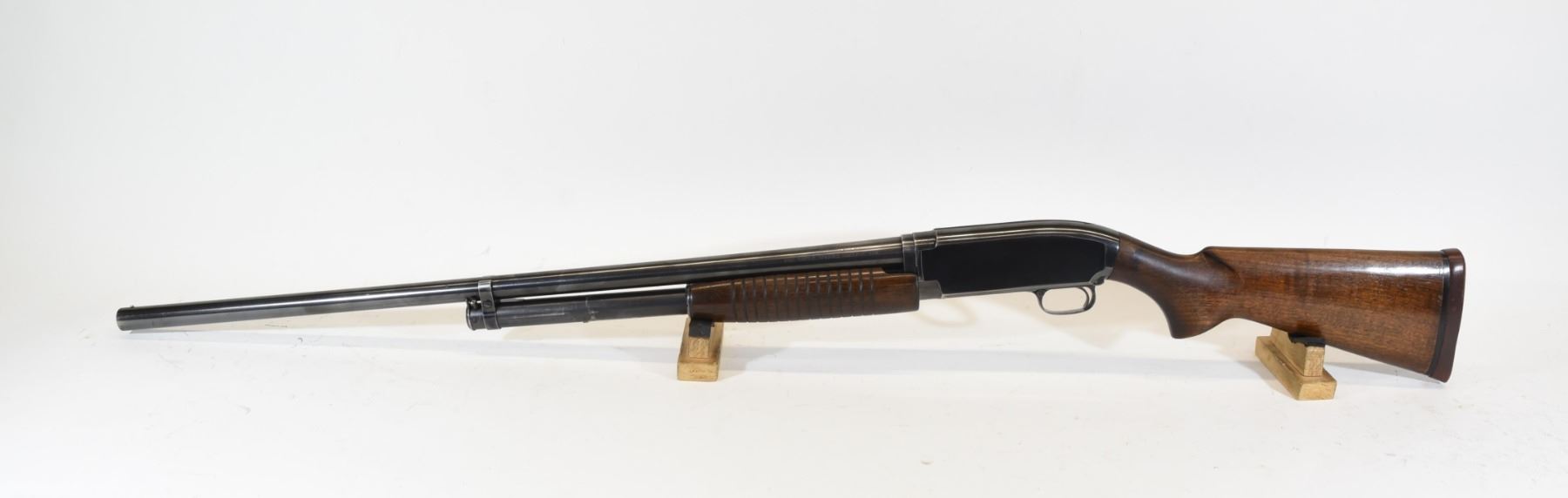 Non-restricted, pump action, 12 Ga x 3", 30" barrel with fixed full choke, SN 1587903. Wood has a dent and some small scratches, bluing turning grey, bore has some streaking. Mfd 1956.