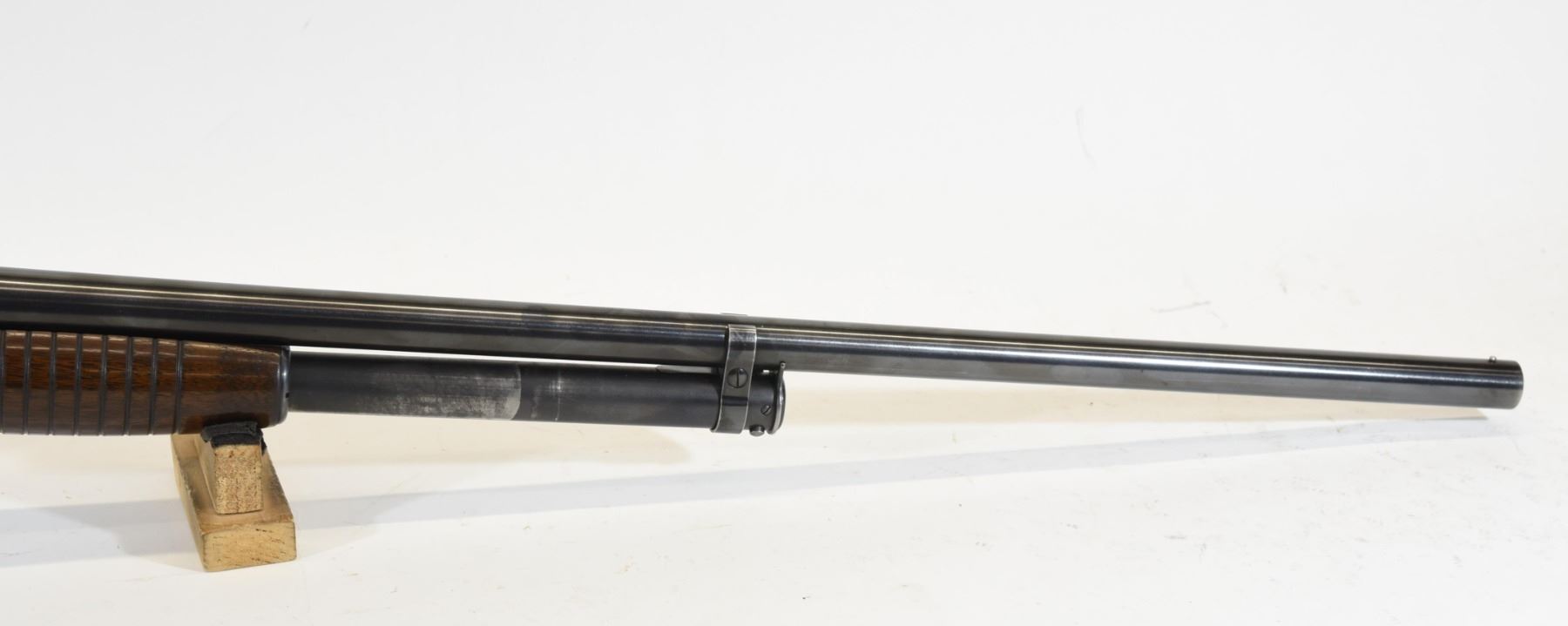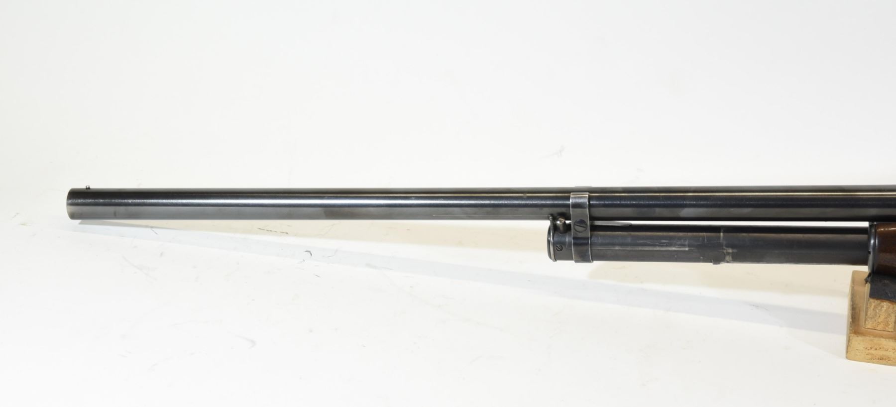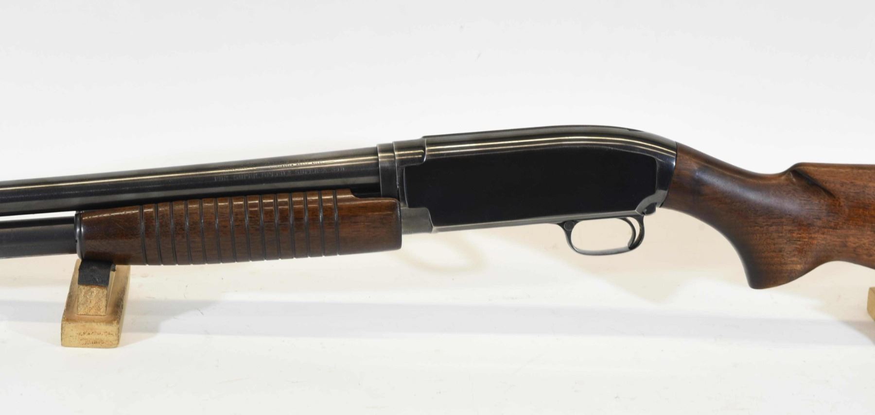 Non-restricted, pump action, 12 Ga x 3", 30" barrel with fixed full choke, SN 1587903. Wood has a dent and some small scratches, bluing turning grey, bore has some streaking. Mfd 1956.